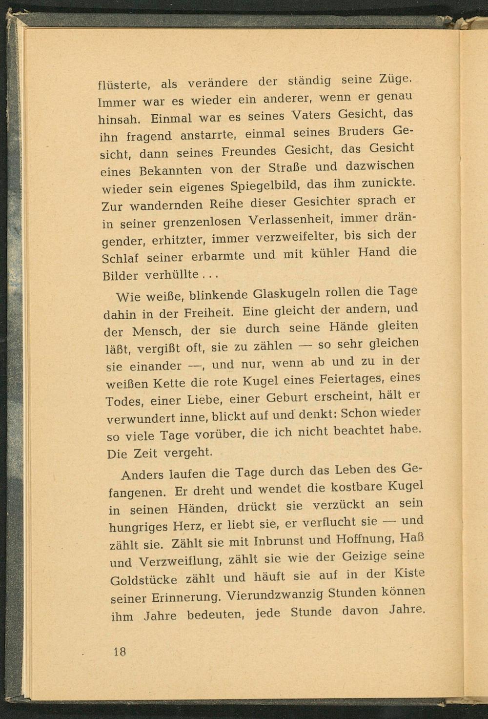 Anders laufen die Tage durch das Leben des Gefangenen. Er dreht und wendet die kostbare Kugel in seinen Händen, drückt sie verzückt an sein hungriges Herz, er liebt sie, er verflucht sie und zählt sie. Zählt sie mit Inbrunst und Hoffnung, Haẞ und Verzweiflung, zählt sie wie der Geizige seine Goldstücke zählt und häuft sie auf in der Kiste seiner Erinnerung. Vierundzwanzig Stunden können ihm Jahre bedeuten, jede Stunde davon Jahre.