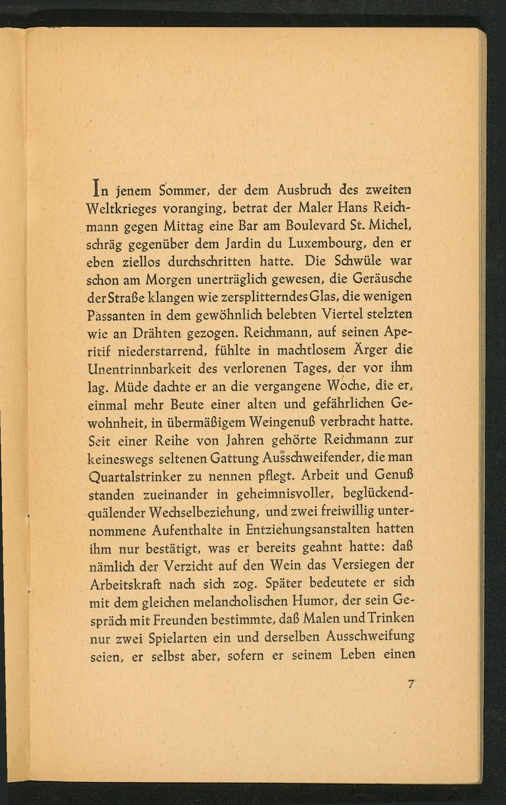 In jenem Sommer, der dem Ausbruch des zweiten Weltkrieges voranging, betrat der Maler Hans Reichmann gegen Mittag eine Bar am Boulevard St. Michel, schräg gegenüber dem Jardin du Luxembourg , den er eben ziellos durchschritten hatte. Die Schwüle war schon am Morgen unerträglich gewesen, die Geräusche der Straße klangen wie zersplitterndes Glas, die wenigen Passanten in dem gewöhnlich belebten Viertel stelzten wie an Drähten gezogen. Reichmann, auf seinen Aperitif niederstarrend, fühlte in machtlosem Ärger die Unentrinnbarkeit des verlorenen Tages, der vor ihm lag. Müde dachte er an die vergangene Woche, die er, einmal mehr Beute einer alten und gefährlichen Gewohnheit, in übermäßigem Weingenuß verbracht hatte. Seit einer Reihe von Jahren gehörte Reichmann zur keineswegs seltenen Gattung Ausschweifender, die man Quartalstrinker zu nennen pflegt. Arbeit und Genuß standen zueinander in geheimnisvoller, beglückendquälender Wechselbeziehung, und zwei freiwillig unternommene Aufenthalte in Entziehungsanstalten hatten ihm nur bestätigt, was er bereits geahnt hatte: daß nämlich der Verzicht auf den Wein das Versiegen der Arbeitskraft nach sich zog. Später bedeutete er sich mit dem gleichen melancholischen Humor, der sein Gespräch mit Freunden bestimmte, daß Malen und Trinken nur zwei Spielarten ein und derselben Ausschweifung seien, er selbst aber, sofern er seinem Leben einen