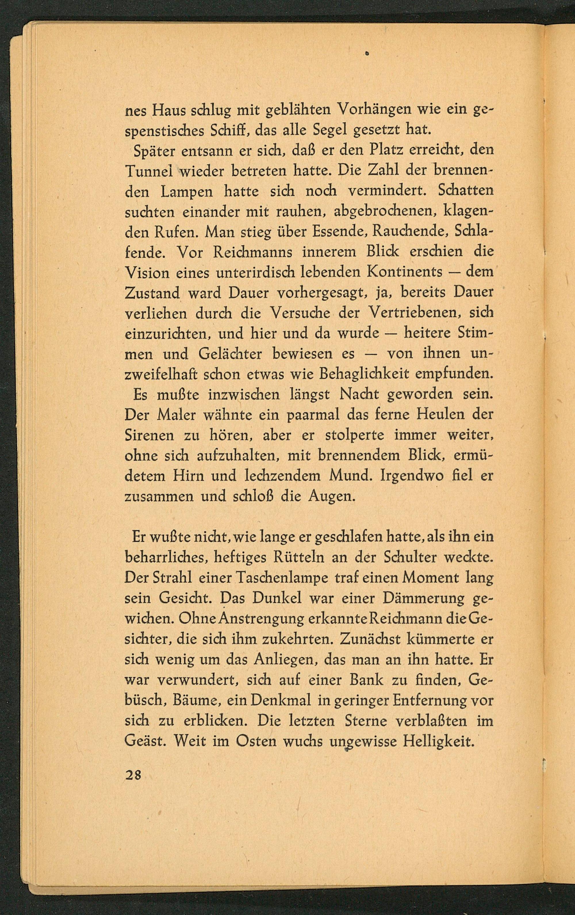 Später entsann er sich, daß er den Platz erreicht, den Tunnel wieder betreten hatte. Die Zahl der brennenden Lampen hatte sich noch vermindert. Schatten suchten einander mit rauhen, abgebrochenen, klagenden Rufen. Man stieg über Essende, Rauchende, Schlafende. Vor Reichmanns innerem Blick erschien die Vision eines unterirdisch lebenden Kontinents dem Zustand ward Dauer vorhergesagt, ja, bereits Dauer verliehen durch die Versuche der Vertriebenen, sich einzurichten, und hier und da wurde- heitere Stimmen und Gelächter bewiesen es von ihnen unzweifelhaft schon etwas wie Behaglichkeit empfunden. Es mußte inzwischen längst Nacht geworden sein. Der Maler wähnte ein paarmal das ferne Heulen der Sirenen zu hören, aber er stolperte immer weiter, ohne sich aufzuhalten, mit brennendem Blick, ermüdetem Hirn und lechzendem Mund. Irgendwo fiel er zusammen und schloß die Augen.