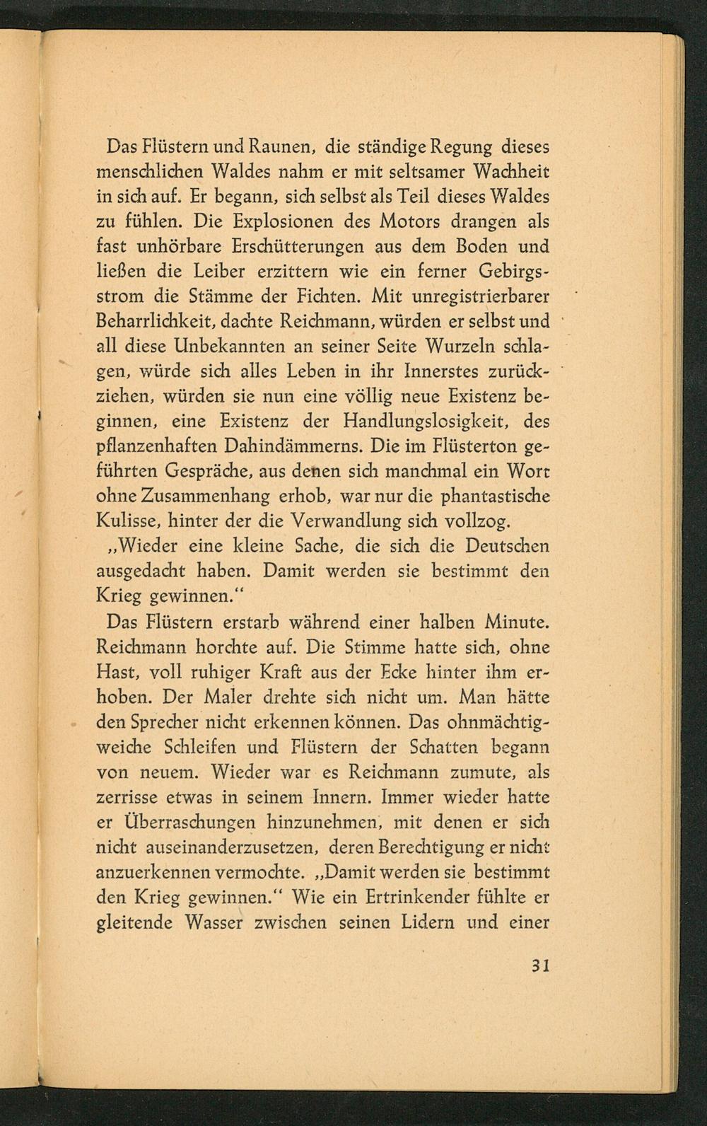Das Flüstern erstarb während einer halben Minute. Reichmann horchte auf. Die Stimme hatte sich, ohne Hast, voll ruhiger Kraft aus der Ecke hinter ihm erhoben. Der Maler drehte sich nicht um. Man hätte den Sprecher nicht erkennen können. Das ohnmächtigweiche Schleifen und Flüstern der Schatten begann von neuem. Wieder war es Reichmann zumute, als zerrisse etwas in seinem Innern. Immer wieder hatte er Überraschungen hinzunehmen, mit denen er sich nicht auseinanderzusetzen, deren Berechtigung er nicht anzuerkennen vermochte. ,, Damit werden sie bestimmt den Krieg gewinnen." Wie ein Ertrinkender fühlte er gleitende Wasser zwischen seinen Lidern und einer