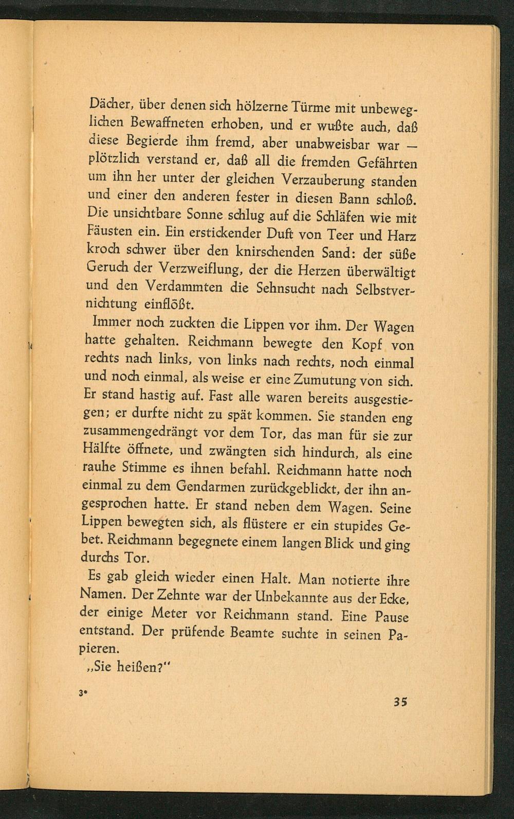 Immer noch zuckten die Lippen vor ihm. Der Wagen hatte gehalten. Reichmann bewegte den Kopf von rechts nach links, von links nach rechts, noch einmal und noch einmal, als weise er eine Zumutung von sich. Er stand hastig auf. Fast alle waren bereits ausgestiegen; er durfte nicht zu spät kommen. Sie standen eng zusammengedrängt vor dem Tor, das man für sie zur Hälfte öffnete, und zwängten sich hindurch, als eine rauhe Stimme es ihnen befahl. Reichmann hatte noch einmal zu dem Gendarmen zurückgeblickt, der ihn angesprochen hatte. Er stand neben dem Wagen. Seine Lippen bewegten sich, als flüstere er ein stupides Gebet. Reichmann begegnete einem langen Blick und ging durchs Tor.