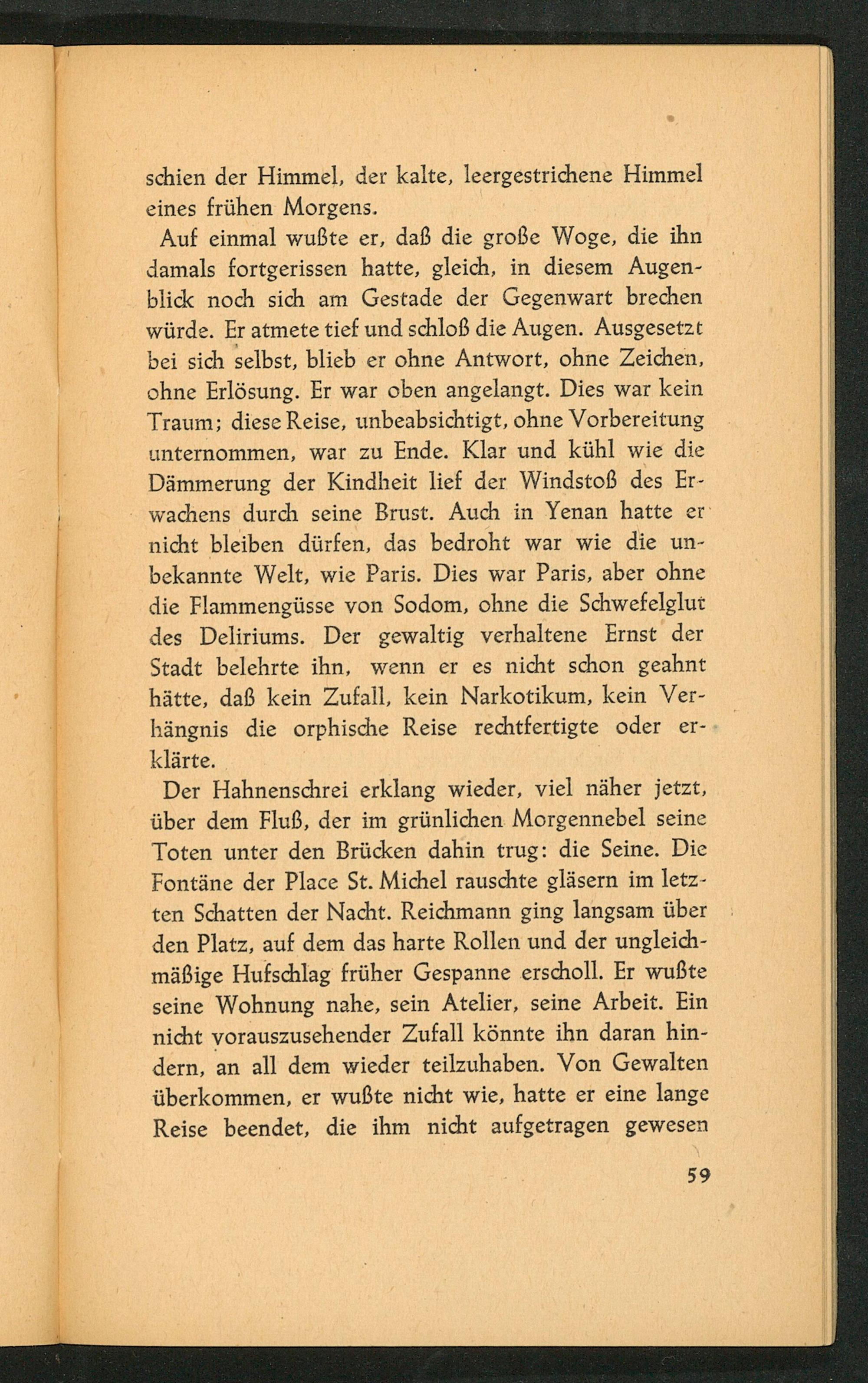 Der Hahnenschrei erklang wieder, viel näher jetzt, über dem Fluß, der im grünlichen Morgennebel seine Toten unter den Brücken dahin trug: die Seine. Die Fontäne der Place St. Michel rauschte gläsern im letzten Schatten der Nacht. Reichmann ging langsam über den Platz, auf dem das harte Rollen und der ungleichmäßige Hufschlag früher Gespanne erscholl. Er wußte seine Wohnung nahe, sein Atelier, seine Arbeit. Ein nicht vorauszusehender Zufall könnte ihn daran hindern, an all dem wieder teilzuhaben. Von Gewalten überkommen, er wußte nicht wie, hatte er eine lange Reise beendet, die ihm nicht aufgetragen gewesen