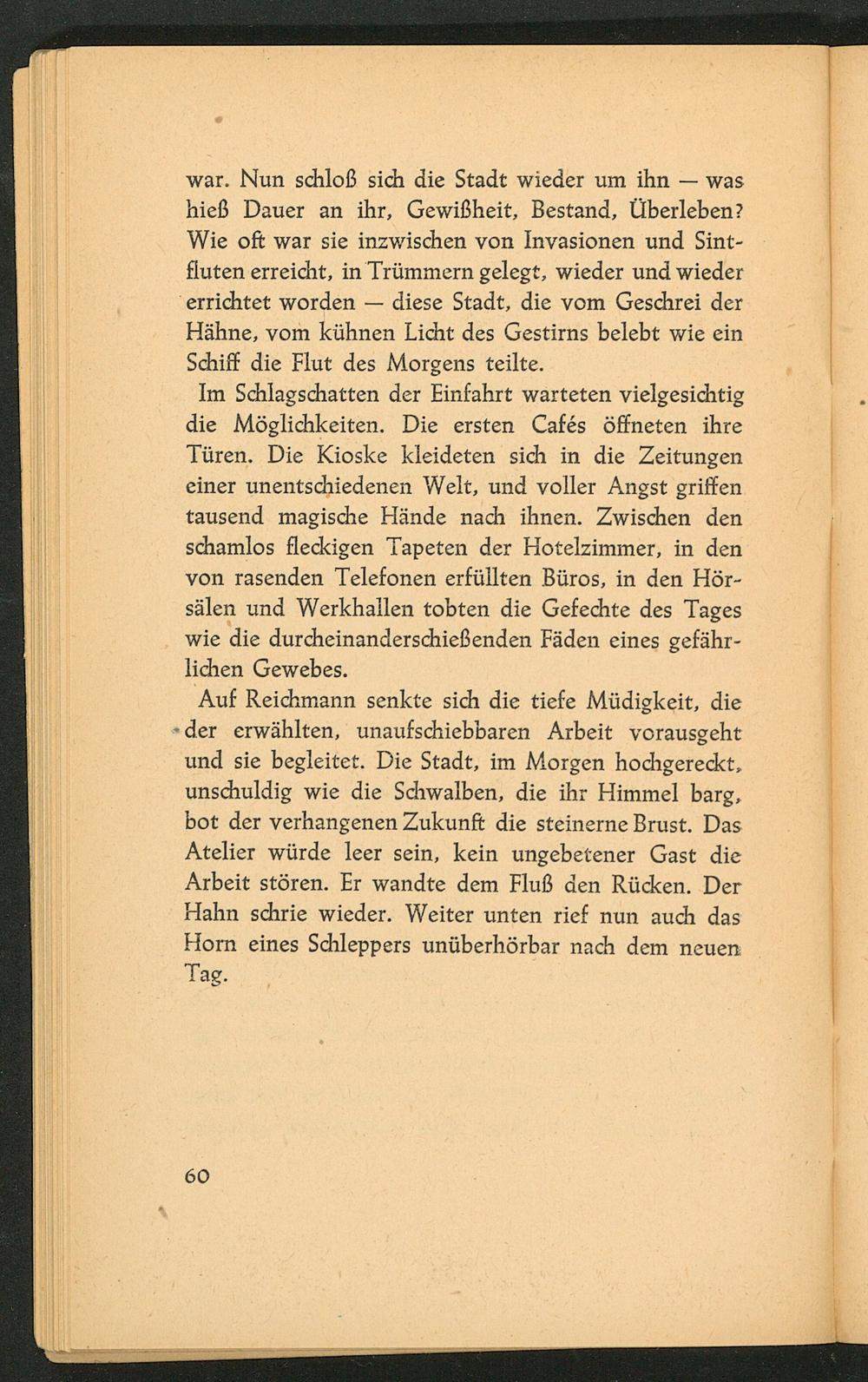Auf Reichmann senkte sich die tiefe Müdigkeit, die der erwählten, unaufschiebbaren Arbeit vorausgeht und sie begleitet. Die Stadt, im Morgen hochgereckt, unschuldig wie die Schwalben, die ihr Himmel barg, bot der verhangenen Zukunft die steinerne Brust. Das Atelier würde leer sein, kein ungebetener Gast die Arbeit stören. Er wandte dem Fluß den Rücken. Der Hahn schrie wieder. Weiter unten rief nun auch das Horn eines Schleppers unüberhörbar nach dem neuen Tag.