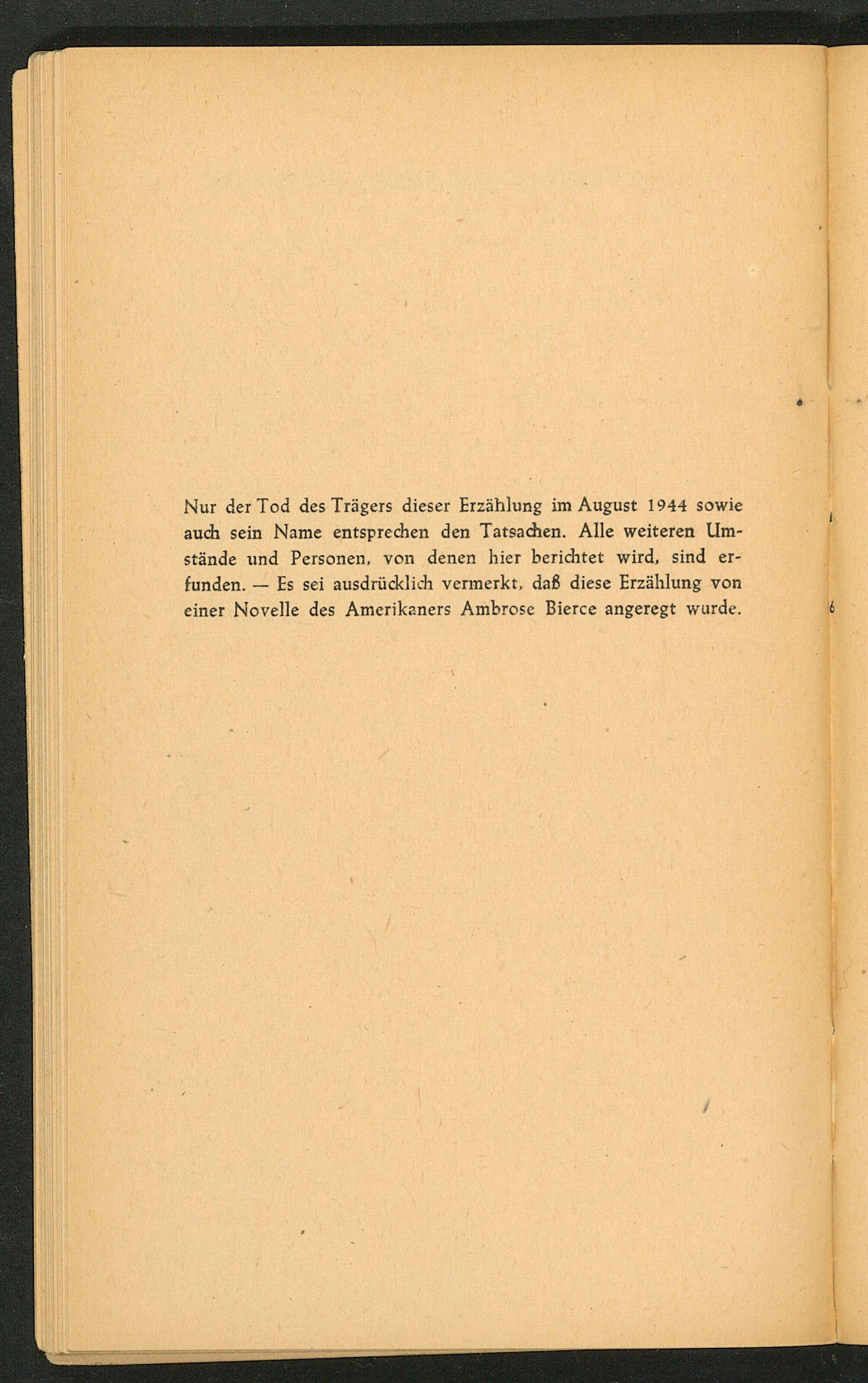 Nur der Tod des Trägers dieser Erzählung im August 1944 sowie auch sein Name entsprechen den Tatsachen. Alle weiteren Um- stände und Personen, von denen hier berichtet wird, sind er- funden.— Es sei ausdrücklich vermerkt, daß diese Erzählung von einer Novelle des Amerikaners Ambrose Bierce angeregt wurde.