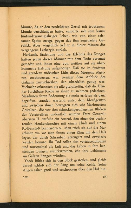 Herkunft, Erziehung und das Erlebnis des Krieges hatten jeden dieser Männer mit dem Tode vertraut gemacht und ihnen eine von weither auf sie überkommene Haltung aufgenötigt. Daß sie im feuchten und geradezu tückischen Licht dieses Morgens zögerten, erschauerten, war weniger dem Anblick des Galgens zuzuschreiben, der schrecklich genug war. Vielmehr erkannten sie alle gleichzeitig, daß die Henker furchtbare Rache an ihnen zu nehmen gedachten. Maschinen deren Bedeutung sie mehr errieten als ganz begriffen, standen wartend unter dem Mordgerüst, und zwischen ihnen bewegten sich wie Marionetten Gestalten, die vor den schreckengeschlagenen Blicken der Verurteilten undeutlich wurden. Dem Generalobersten H. entfuhr ein Ausruf, den einer der begleitenden Henkersknechte mit einem Fluch und einem Kolbenstoß beantwortete. Man trieb sie auf die Maschinen zu, wo man ihnen einen Ring um den Hals legte, der durch Schrauben verengert und erweitert werden konnte. Ihr Tod sollte sich vertausendfachen und tausendmal die Luft und das Leben in ihre berstenden Lungen zurückströmen, ehe ihre Leichname am Galgen hängen würden.
