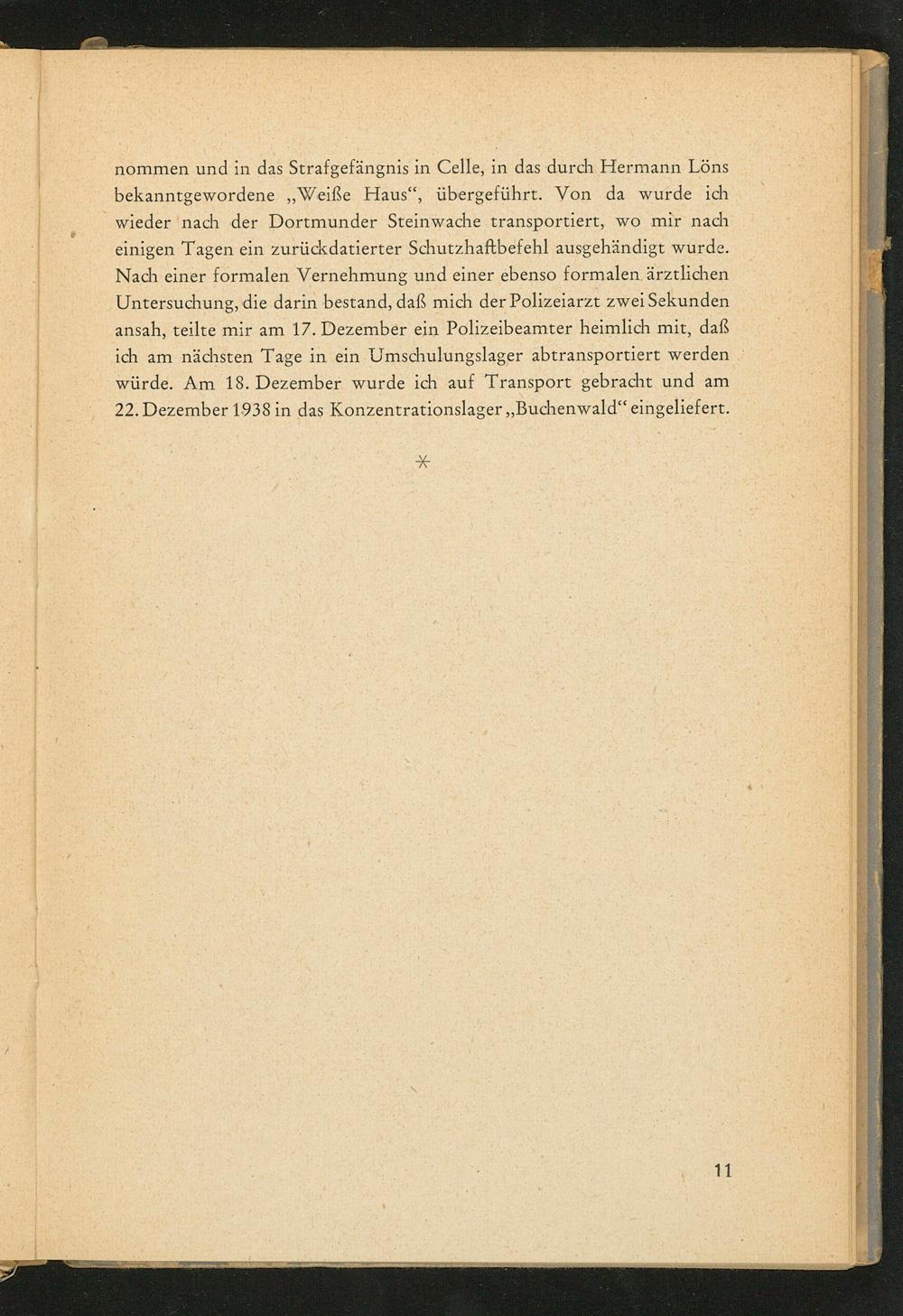 nommen und in das Strafgefängnis in Celle, in das durch Hermann Löns bekanntgewordene ,, Weiße Haus", übergeführt. Von da wurde ich wieder nach der Dortmunder Steinwache transportiert, wo mir nach einigen Tagen ein zurückdatierter Schutzhaftbefehl ausgehändigt wurde. Nach einer formalen Vernehmung und einer ebenso formalen ärztlichen Untersuchung, die darin bestand, daß mich der Polizeiarzt zwei Sekunden ansah, teilte mir am 17. Dezember ein Polizeibeamter heimlich mit, daß ich am nächsten Tage in ein Umschulungslager abtransportiert werden würde. Am 18. Dezember wurde ich auf Transport gebracht und am 22. Dezember 1938 in das Konzentrationslager ,, Buchenwald" eingeliefert.