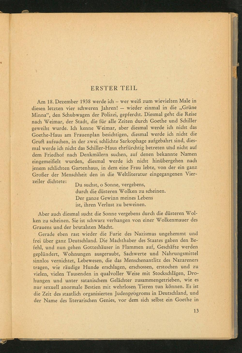 Am 18. Dezember 1938 werde ich wer weiß zum wievielten Male in diesen letzten vier schweren Jahren!- wieder einmal in die ,, Grüne Minna", den Schubwagen der Polizei, gepfercht. Diesmal geht die Reise nach Weimar , der Stadt, die für alle Zeiten durch Goethe und Schiller geweiht wurde. Ich kenne Weimar , aber diesmal werde ich nicht das Goethe- Haus am Frauenplan besichtigen, diesmal werde ich nicht die Gruft aufsuchen, in der zwei schlichte Sarkophage aufgebahrt sind, diesmal werde ich nicht das Schiller- Haus ehrfürchtig betreten und nicht auf dem Friedhof nach Denkmälern suchen, auf denen bekannte Namen eingemeißelt wurden, diesmal werde ich nicht hinübergehen nach jenem schlichten Gartenhaus, in dem eine Frau lebte, von der ein ganz Großer der Menschheit den in die Weltliteratur eingegangenen Vierzeiler dichtete: