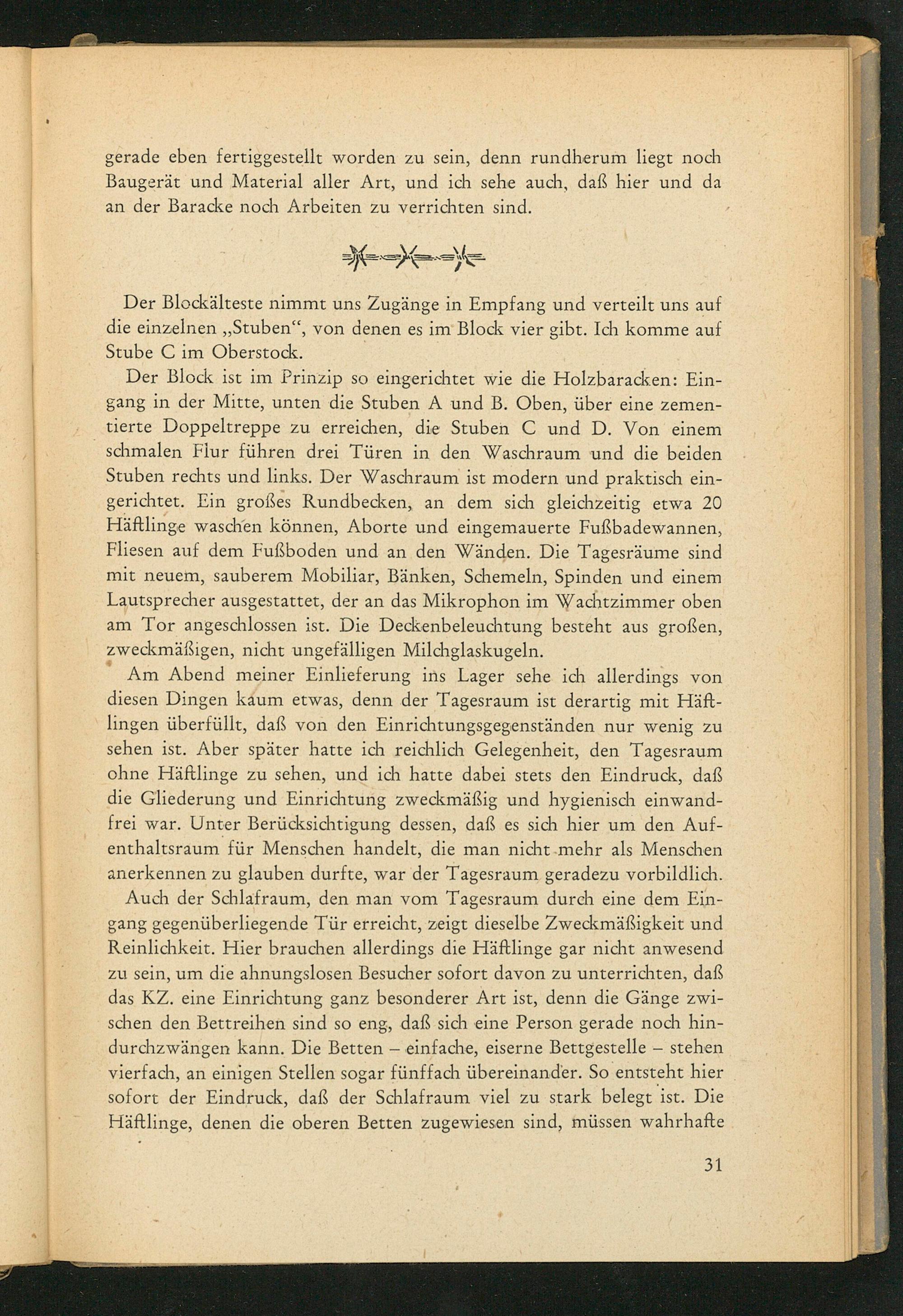 Der Block ist im Prinzip so eingerichtet wie die Holzbaracken: Eingang in der Mitte, unten die Stuben A und B. Oben, über eine zementierte Doppeltreppe zu erreichen, die Stuben C und D. Von einem schmalen Flur führen drei Türen in den Waschraum und die beiden Stuben rechts und links. Der Waschraum ist modern und praktisch eingerichtet. Ein großes Rundbecken, an dem sich gleichzeitig etwa 20 Häftlinge waschen können, Aborte und eingemauerte Fußbadewannen, Fliesen auf dem Fußboden und an den Wänden. Die Tagesräume sind mit neuem, sauberem Mobiliar, Bänken, Schemeln, Spinden und einem Lautsprecher ausgestattet, der an das Mikrophon im Wachtzimmer oben am Tor angeschlossen ist. Die Deckenbeleuchtung besteht aus großen, zweckmäßigen, nicht ungefälligen Milchglaskugeln.