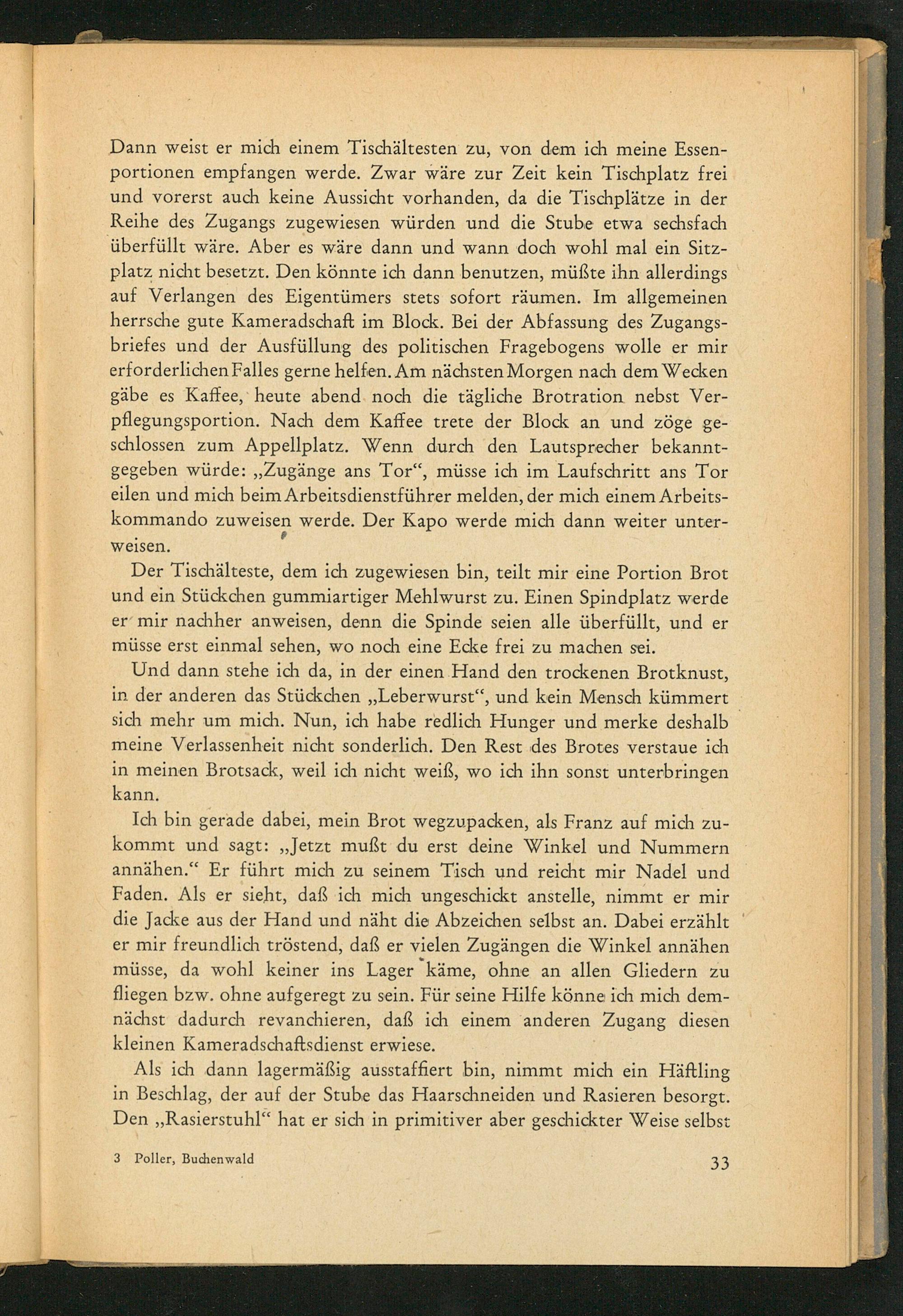 Ich bin gerade dabei, mein Brot wegzupacken, als Franz auf mich zukommt und sagt: ,, Jetzt mußt du erst deine Winkel und Nummern annähen." Er führt mich zu seinem Tisch und reicht mir Nadel und Faden. Als er sieht, daß ich mich ungeschickt anstelle, nimmt er mir die Jacke aus der Hand und näht die Abzeichen selbst an. Dabei erzählt er mir freundlich tröstend, daß er vielen Zugängen die Winkel annähen müsse, da wohl keiner ins Lager käme, ohne an allen Gliedern zu fliegen bzw. ohne aufgeregt zu sein. Für seine Hilfe könne ich mich demnächst dadurch revanchieren, daß ich einem anderen Zugang diesen kleinen Kameradschaftsdienst erwiese.