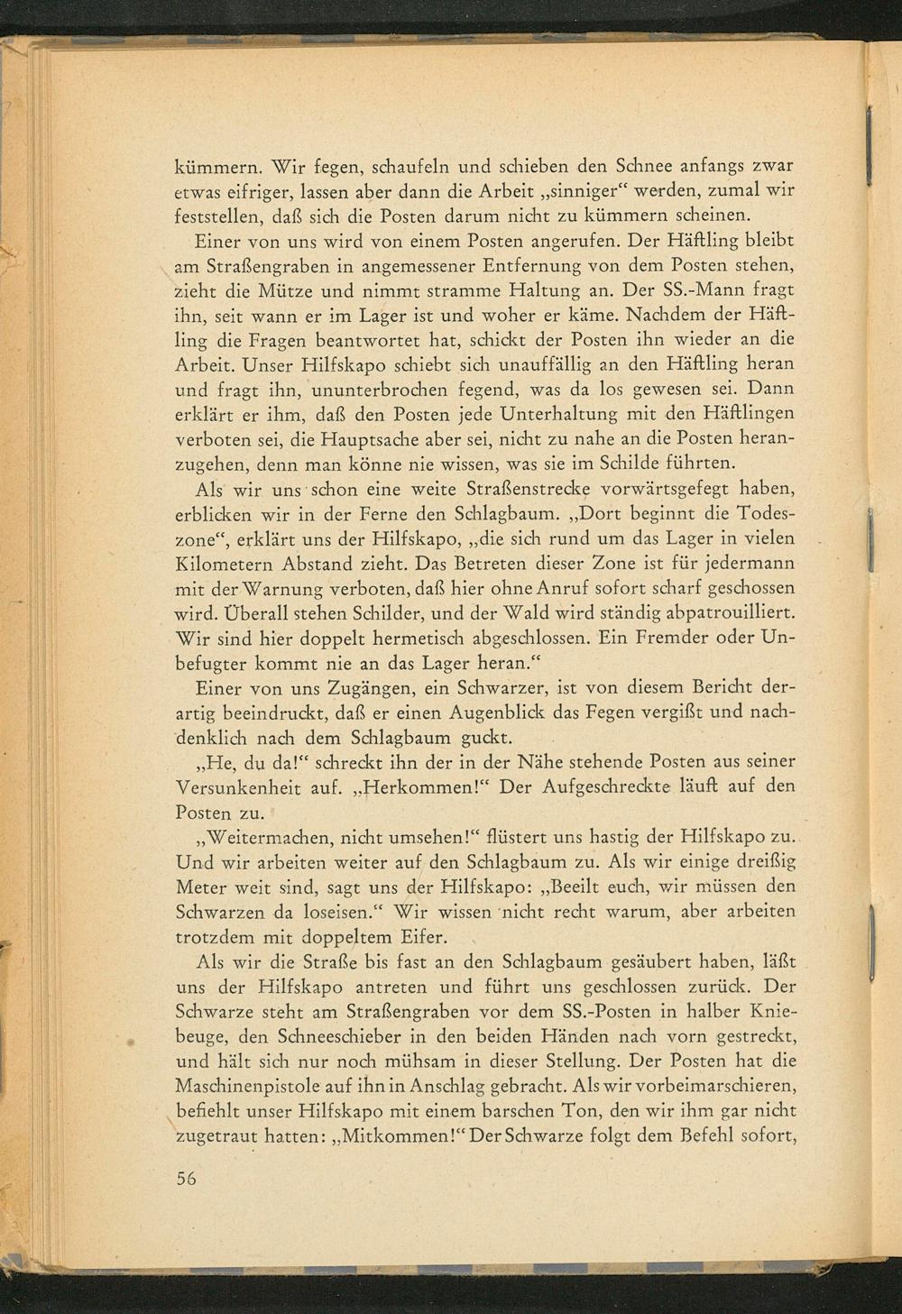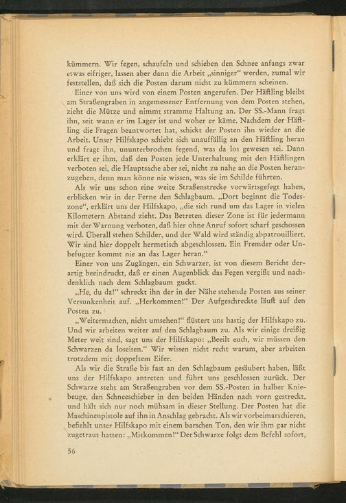 „Weitermachen, nicht umsehen!“ flüstert uns hastig der Hilfskapo zu. Und wir arbeiten weiter auf den Schlagbaum zu. Als wir einige dreißig Meter weit sind, sagt uns der Hilfskapo:„Beeilt euch, wir müssen den Schwarzen da loseisen.‘“ Wir wissen‘nicht recht warum, aber arbeiten trotzdem mit doppeltem Eifer.