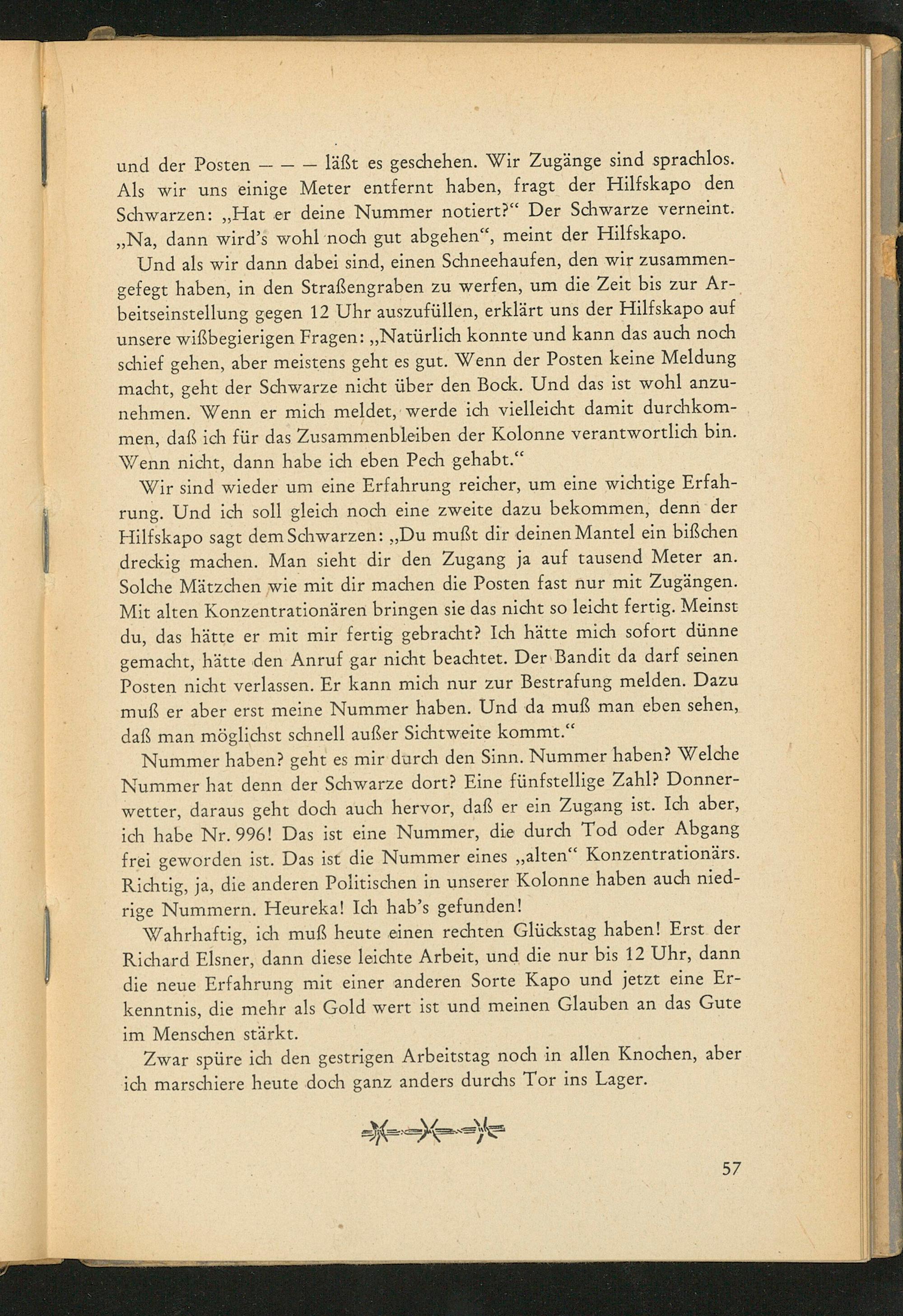 Und als wir dann dabei sind, einen Schneehaufen, den wir zusammengefegt haben, in den Straßengraben zu werfen, um die Zeit bis zur Arbeitseinstellung gegen 12 Uhr auszufüllen, erklärt uns der Hilfskapo auf unsere wiẞbegierigen Fragen: ,, Natürlich konnte und kann das auch noch schief gehen, aber meistens geht es gut. Wenn der Posten keine Meldung macht, geht der Schwarze nicht über den Bock. Und das ist wohl anzunehmen. Wenn er mich meldet, werde ich vielleicht damit durchkommen, daß ich für das Zusammenbleiben der Kolonne verantwortlich bin. Wenn nicht, dann habe ich eben Pech gehabt."