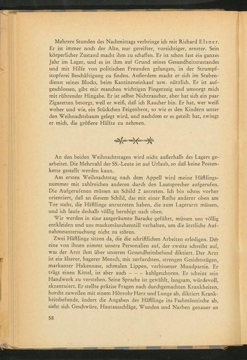 Mehrere Stunden des Nachmittags verbringe ich mit Richard Elsner. Er ist immer noch der Alte, nur gereifter, vorsichtiger, ernster. Sein körperlicher Zustand macht ihm zu schaffen. Er ist schon fast ein ganzes Jahr im Lager, und es ist ihm auf Grund seines Gesundheitszustandes und mit Hilfe von politischen Freunden gelungen, in der Strumpfstopferei Beschäftigung zu finden. Außerdem macht er sich im Stubendienst seines Blocks, beim Kantineneinkauf usw. nützlich. Er ist aufgeschlossen, gibt mir manchen wichtigen Fingerzeig und umsorgt mich mit rührender Hingabe. Er ist selbst Nichtraucher, aber hat sich ein paar Zigaretten besorgt, weil er weiß, daß ich Raucher bin. Er hat, wer weiß woher und wie, ein Stückchen Feigenbrot, so wie es den Kindern unter den Weihnachtsbaum gelegt wird, und nachdem er es geteilt hat, zwingt er mich, die größere Hälfte zu nehmen.