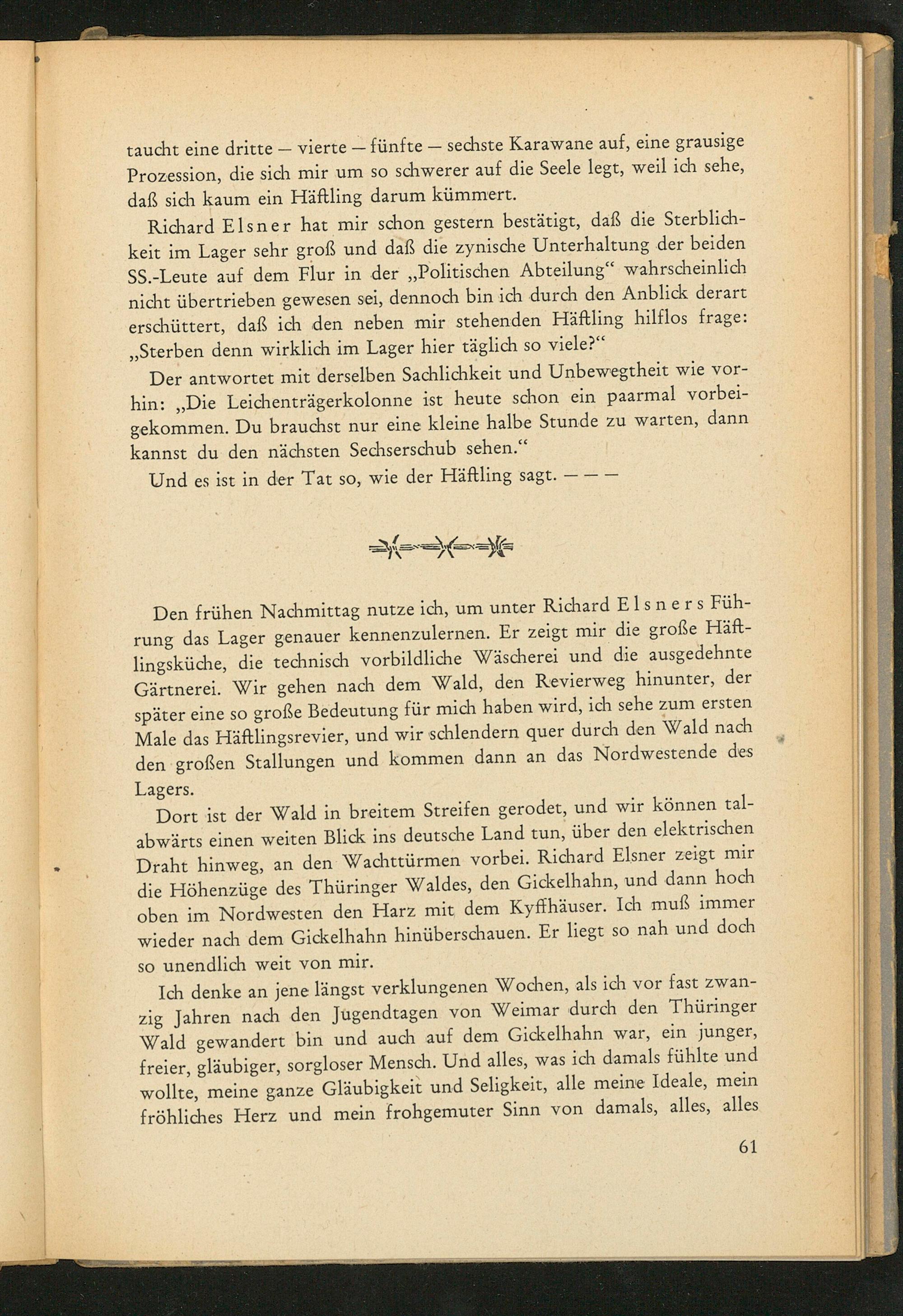 Den frühen Nachmittag nutze ich, um unter Richard Elsners Führung das Lager genauer kennenzulernen. Er zeigt mir die große Häftlingsküche, die technisch vorbildliche Wäscherei und die ausgedehnte Gärtnerei. Wir gehen nach dem Wald, den Revierweg hinunter, der später eine so große Bedeutung für mich haben wird, ich sehe zum ersten Male das Häftlingsrevier, und wir schlendern quer durch den Wald nach den großen Stallungen und kommen dann an das Nordwestende des Lagers.