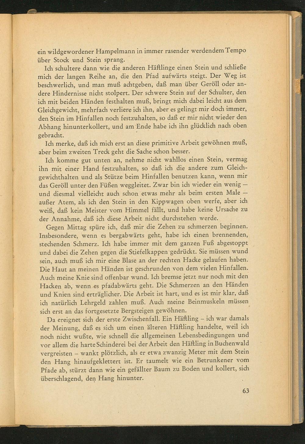 Da ereignet sich der erste Zwischenfall. Ein Häftling- ich war damals der Meinung, daß es sich um einen älteren Häftling handelte, weil ich noch nicht wußte, wie schnell die allgemeinen Lebensbedingungen und vor allem die harte Schinderei bei der Arbeit den Häftling in Buchenwald vergreistenwankt plötzlich, als er etwa zwanzig Meter mit dem Stein den Hang hinaufgeklettert ist. Er taumelt wie ein Betrunkener vom Pfade ab, stürzt dann wie ein gefällter Baum zu Boden und kollert, sich überschlagend, den Hang hinunter.