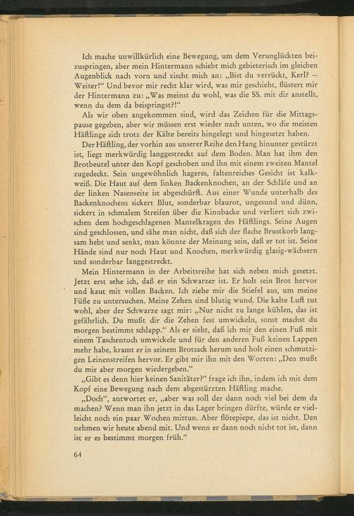 Ich mache unwillkürlich eine Bewegung, um dem Verunglückten beizuspringen, aber mein Hintermann schiebt mich gebieterisch im gleichen Augenblick nach vorn und zischt mich an: ,, Bist du verrückt, Kerl? Weiter!" Und bevor mir recht klar wird, was mir geschieht, flüstert mir der Hintermann zu: ,, Was meinst du wohl, was die SS. mit dir anstellt, wenn du dem da beispringst?!"