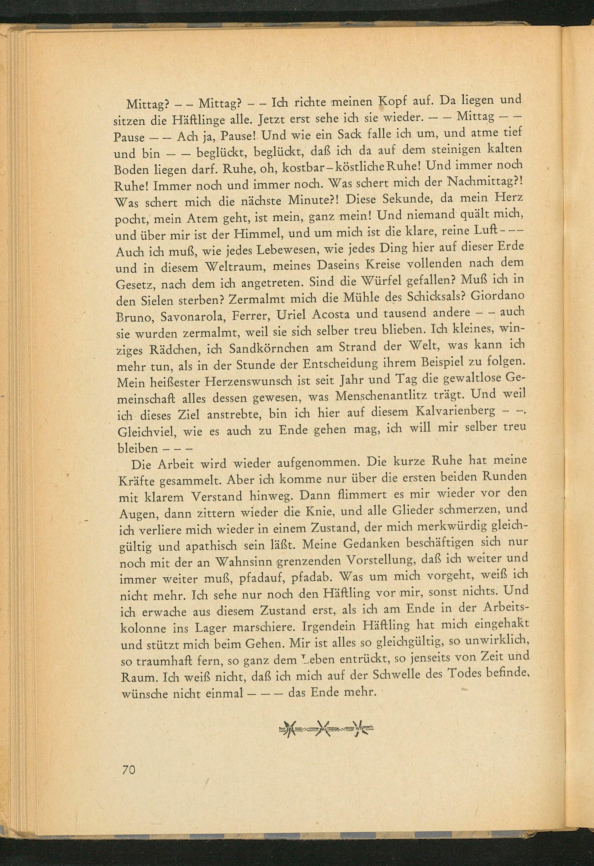 Mittag?-- Mittag? Ich richte meinen Kopf auf. Da liegen und sitzen die Häftlinge alle. Jetzt erst sehe ich sie wieder.-- Mittag- Pause Ach ja, Pause! Und wie ein Sack falle ich um, und atme tief und bin beglückt, beglückt, daß ich da auf dem steinigen kalten Boden liegen darf. Ruhe, oh, kostbar- köstliche Ruhe! Und immer noch Ruhe! Immer noch und immer noch. Was schert mich der Nachmittag?! Was schert mich die nächste Minute?! Diese Sekunde, da mein Herz pocht, mein Atem geht, ist mein, ganz mein! Und niemand quält mich, und über mir ist der Himmel, und um mich ist die klare, reine Luft--Auch ich muß, wie jedes Lebewesen, wie jedes Ding hier auf dieser Erde und in diesem Weltraum, meines Daseins Kreise vollenden nach dem Gesetz, nach dem ich angetreten. Sind die Würfel gefallen? Muß ich in den Sielen sterben? Zermalmt mich die Mühle des Schicksals? Giordano Bruno, Savonarola, Ferrer, Uriel Acosta und tausend andere-- auch sie wurden zermalmt, weil sie sich selber treu blieben. Ich kleines, winziges Rädchen, ich Sandkörnchen am Strand der Welt, was kann ich mehr tun, als in der Stunde der Entscheidung ihrem Beispiel zu folgen. Mein heißester Herzenswunsch ist seit Jahr und Tag die gewaltlose Gemeinschaft alles dessen gewesen, was Menschenantlitz trägt. Und weil ich dieses Ziel anstrebte, bin ich hier auf diesem Kalvarienberg--. Gleichviel, wie es auch zu Ende gehen mag, ich will mir selber treu bleiben-