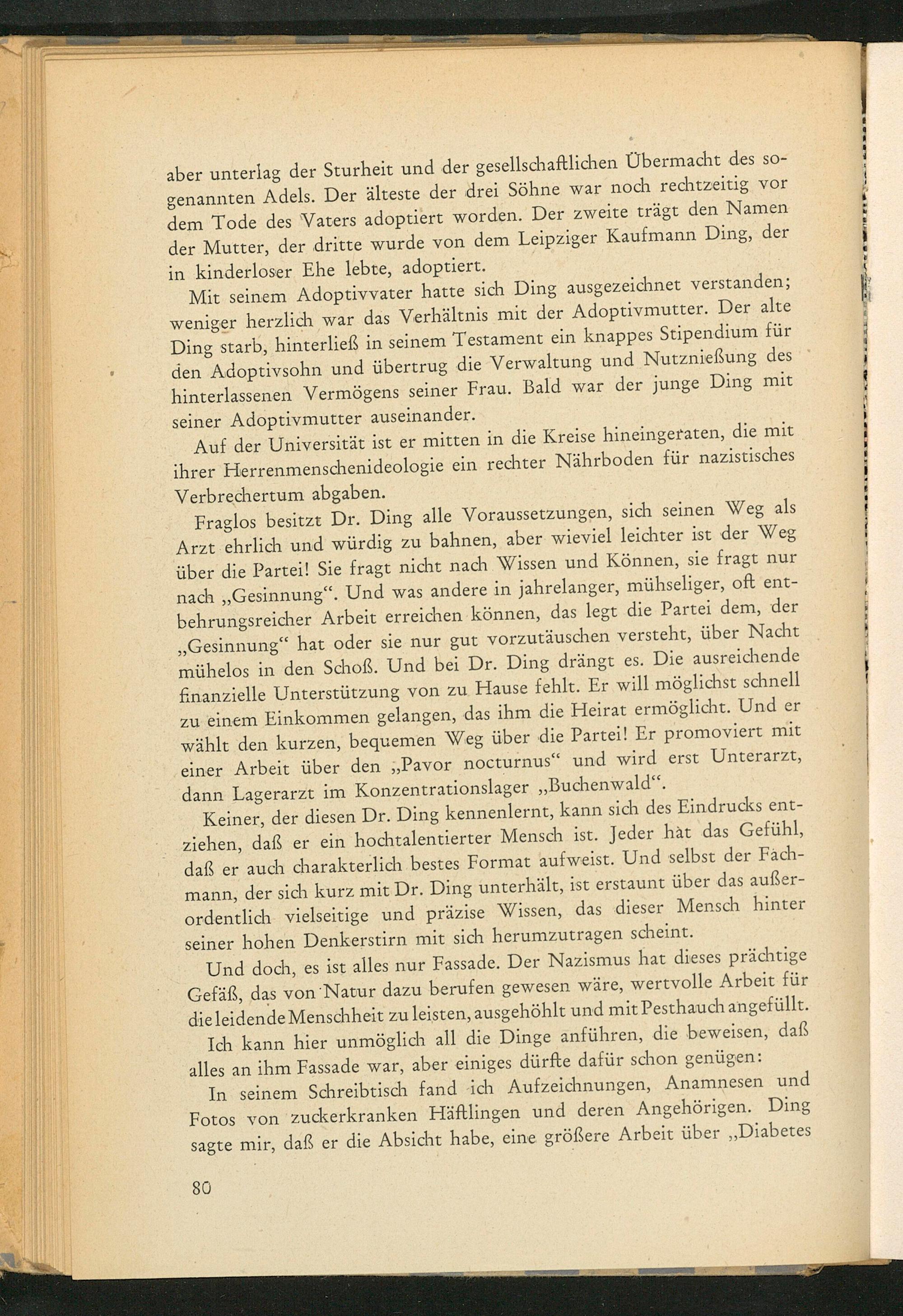 Fraglos besitzt Dr. Ding alle Voraussetzungen, sich seinen Weg als Arzt ehrlich und würdig zu bahnen, aber wieviel leichter ist der Weg über die Partei! Sie fragt nicht nach Wissen und Können, sie fragt nur nach ,, Gesinnung". Und was andere in jahrelanger, mühseliger, oft entbehrungsreicher Arbeit erreichen können, das legt die Partei dem, der Gesinnung" hat oder sie nur gut vorzutäuschen versteht, über Nacht mühelos in den Schoß. Und bei Dr. Ding drängt es. Die ausreichende finanzielle Unterstützung von zu Hause fehlt. Er will möglichst schnell zu einem Einkommen gelangen, das ihm die Heirat ermöglicht. Und er wählt den kurzen, bequemen Weg über die Partei! Er promoviert mit einer Arbeit über den ,, Pavor nocturnus" und wird erst Unterarzt, dann Lagerarzt im Konzentrationslager ,, Buchenwald".