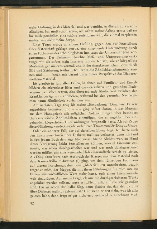 Eines Tages wurde an einem Häftling, gegen den auf Feststellung einer Vaterschaft geklagt wurde, eine eingehende Untersuchung durch einen Fachmann des erbbiologischen Institutes der Universität Jena vorgenommen. Der Fachmann brachte Meß- und Untersuchungswerkzeuge mit, die sofort mein Interesse fanden. Ich sah, wie er körperliche Merkmale genauestens vermaß und in der charakteristischen Form durch Bild und Zeichnung festhielt. Ich lernte die Ähnlichkeitsdiagnostik kennen und besah mir darauf unter dieser Perspektive das Diabetesmellitus- Material.