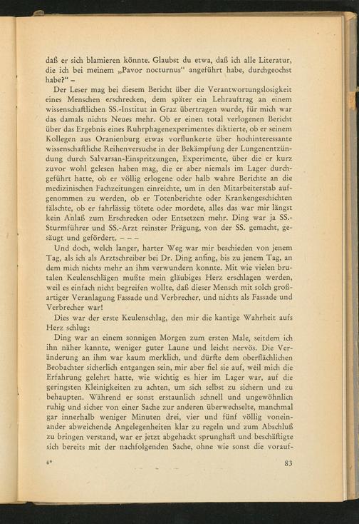 Der Leser mag bei diesem Bericht über die Verantwortungslosigkeit eines Menschen erschrecken, dem später ein Lehrauftrag an einem wissenschaftlichen SS.- Institut in Graz übertragen wurde, für mich war das damals nichts Neues mehr. Ob er einen total verlogenen Bericht über das Ergebnis eines Ruhrphagenexperimentes diktierte, ob er seinem Kollegen aus Oranienburg etwas vorflunkerte über hochinteressante wissenschaftliche Reihenversuche in der Bekämpfung der Lungenentzündung durch Salvarsan- Einspritzungen, Experimente, über die er kurz zuvor wohl gelesen haben mag, die er aber niemals im Lager durchgeführt hatte, ob er völlig erlogene oder halb wahre Berichte an die medizinischen Fachzeitungen einreichte, um in den Mitarbeiterstab aufgenommen zu werden, ob er Totenberichte oder Krankengeschichten fälschte, ob er fahrlässig tötete oder mordete, alles das war mir längst kein Anlaß zum Erschrecken oder Entsetzen mehr. Ding war ja SS. Sturmführer und SS.- Arzt reinster Prägung, von der SS . gemacht, gesäugt und gefördert.--