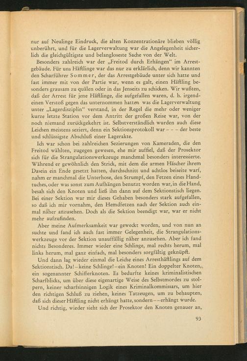 Besonders zahlreich war der ‚Freitod durch Erhängen“ im Arrest- gebäude. Für uns Häftlinge war das nur zu erklärlich, denn wir kannten den Scharführer Sommer, der das Arrestgebäude unter sich hatte und fast immer mit von der Partie war, wenn es galt, einen Häftling be- sonders grausam zu quälen oder in das Jenseits zu schicken. Wir wußten, daß der Arrest für jene Häftlinge, die aufgefallen waren, d. h. irgend- einen Verstoß gegen das unternommen hatten was die Lagerverwaltung unter„Lagerdisziplin“ verstand, in der Regel die mehr oder weniger kurze letzte Station vor dem Antritt der großen Reise war, von der noch niemand zurückgekehrt ist. Selbstverständlich wurden auch diese Leichen meistens seziert, denn ein Sektionsprotokoll war--- der beste und schlüssigste Abschluß einer Lagerakte.