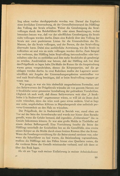 Wie gesagt, es war ein fein säuberlich ausgearbeitetes Formular, und den Befürwortern der Prügelstrafe wünsche ich von ganzem Herzen nur 5 Stockhiebe unter genauester Innehaltung der gedruckten Vorschriften. Obgleich ich auch weiß, daß diesen Befürwortern weit eher ,, 5 Stockhiebe à la Buchenwald " angemessener wären, so will ich sie ihnen doch nicht wünschen, denn das wäre noch ganz etwas anderes. Und es liegt mir nicht, ungehobelten Klötzen in Menschengestalt eine sadistisch perverse Grausamkeit an den Hals zu wünschen.