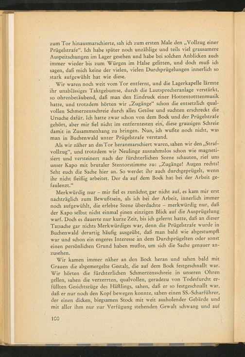 zum Tor hinausmarschierte, sah ich zum ersten Male den ,, Vollzug einer Prügelstrafe". Ich habe später noch unzählige und teils viel grausamere Auspeitschungen im Lager gesehen und habe bei solchen Anblicken auch immer wieder bis zum Würgen im Halse gelitten, und doch muß ich sagen, daß mich keine der vielen, vielen Durchprügelungen innerlich so stark aufgewühlt hat wie diese.