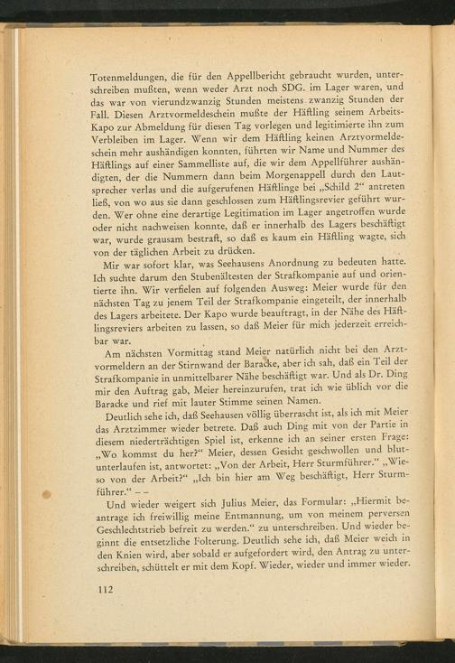 Mir war sofort klar, was Seehausens Anordnung zu bedeuten hatte. Ich suchte darum den Stubenältesten der Strafkompanie auf und orientierte ihn. Wir verfielen auf folgenden Ausweg: Meier wurde für den nächsten Tag zu jenem Teil der Strafkompanie eingeteilt, der innerhalb des Lagers arbeitete. Der Kapo wurde beauftragt, in der Nähe des Häftlingsreviers arbeiten zu lassen, so daß Meier für mich jederzeit erreichbar war.