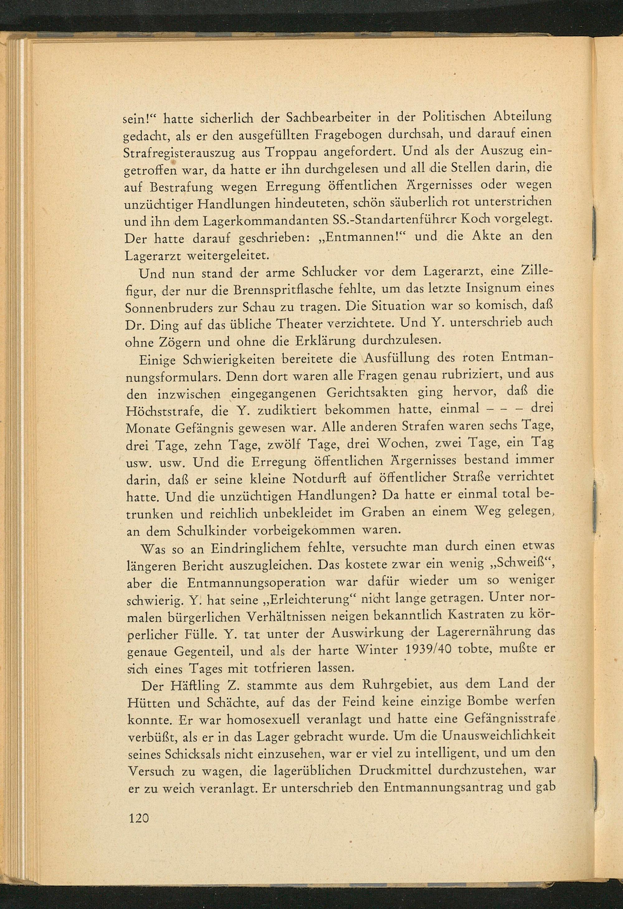 Der Häftling Z. stammte aus dem Ruhrgebiet , aus dem Land der Hütten und Schächte, auf das der Feind keine einzige Bombe werfen konnte. Er war homosexuell veranlagt und hatte eine Gefängnisstrafe, verbüßt, als er in das Lager gebracht wurde. Um die Unausweichlichkeit. seines Schicksals nicht einzusehen, war er viel zu intelligent, und um den Versuch zu wagen, die lagerüblichen Druckmittel durchzustehen, war er zu weich veranlagt. Er unterschrieb den Entmannungsantrag und gab