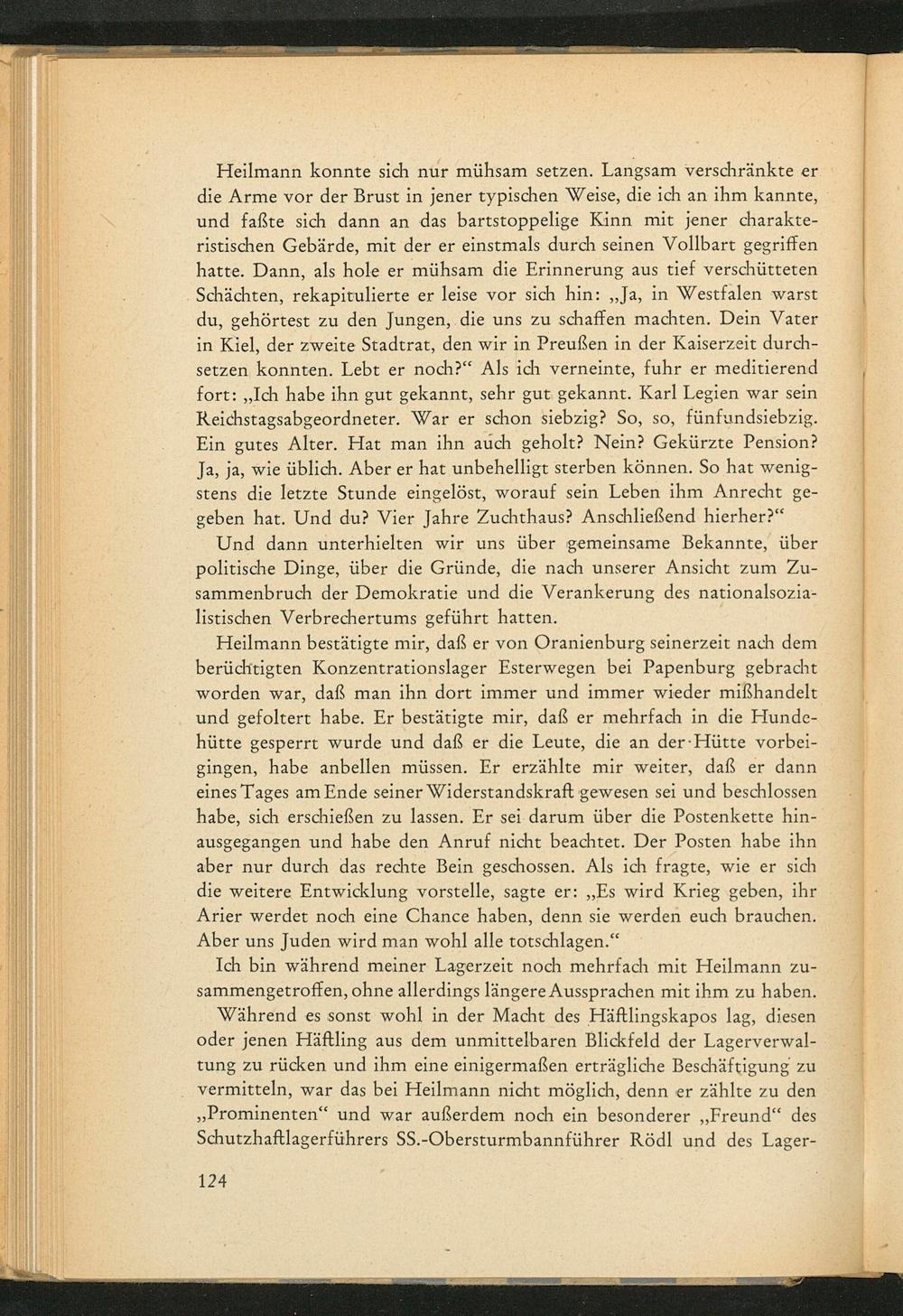 Heilmann bestätigte mir, daß er von Oranienburg seinerzeit nach dem berüchtigten Konzentrationslager Esterwegen bei Papenburg gebracht worden war, daß man ihn dort immer und immer wieder mißhandelt und gefoltert habe. Er bestätigte mir, daß er mehrfach in die Hunde- hütte gesperrt wurde und daß er die Leute, die an der-Hütte vorbei- gingen, habe anbellen müssen. Er erzählte mir weiter, daß er dann eines Tages am Ende seiner Widerstandskraft gewesen sei und beschlossen habe, sich erschießen zu lassen. Er sei darum über die Postenkette hin- ausgegangen und habe den Anruf nicht beachtet. Der Posten habe ihn aber nur durch das rechte Bein geschossen. Als ich fragte, wie er sich die weitere Entwicklung vorstelle, sagte er:„Es wird Krieg geben, ihr Arier werdet noch eine Chance haben, denn sie werden euch brauchen. Aber uns Juden wird man wohl alle totschlagen.“