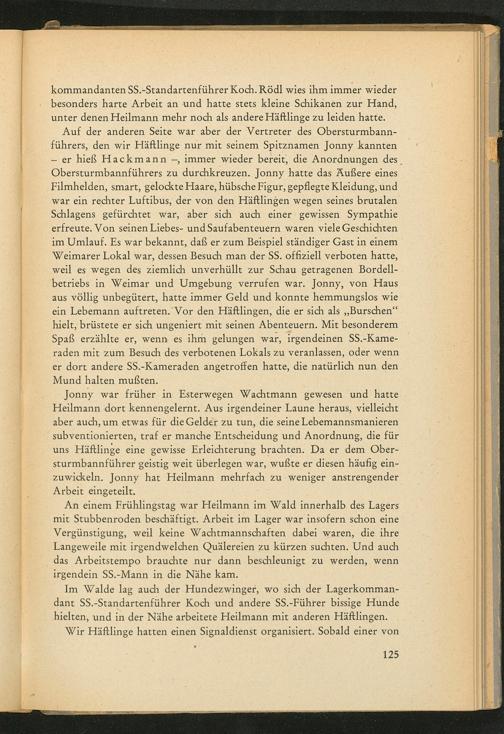 Auf der anderen Seite war aber der Vertreter des Obersturmbannführers, den wir Häftlinge nur mit seinem Spitznamen Jonny kannten - er hieß Hackmann-, immer wieder bereit, die Anordnungen des. Obersturmbannführers zu durchkreuzen. Jonny hatte das Äußere eines Filmhelden, smart, gelockte Haare, hübsche Figur, gepflegte Kleidung, und war ein rechter Luftibus, der von den Häftlingen wegen seines brutalen Schlagens gefürchtet war, aber sich auch einer gewissen Sympathie erfreute. Von seinen Liebes- und Saufabenteuern waren viele Geschichten im Umlauf. Es war bekannt, daß er zum Beispiel ständiger Gast in einem Weimarer Lokal war, dessen Besuch man der SS. offiziell verboten hatte, weil es wegen des ziemlich unverhüllt zur Schau getragenen Bordellbetriebs in Weimar und Umgebung verrufen war. Jonny, von Haus aus völlig unbegütert, hatte immer Geld und konnte hemmungslos wie ein Lebemann auftreten. Vor den Häftlingen, die er sich als ,, Burschen" hielt, brüstete er sich ungeniert mit seinen Abenteuern. Mit besonderem Spaß erzählte er, wenn es ihm gelungen war, irgendeinen SS. - Kameraden mit zum Besuch des verbotenen Lokals zu veranlassen, oder wenn er dort andere SS.- Kameraden angetroffen hatte, die natürlich nun den Mund halten mußten.