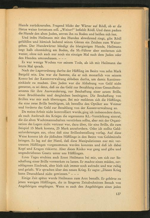 Und indes Heilmann mit den Hunden abwehrend ringt, gibt Rödl gefühllos und hämisch lachend seinen Gästen ein Zeichen zum Weitergehen. Der Hundewärter bändigt die blutgierigen Hunde, Heilmann liegt halb ohnmächtig am Boden, die SS. - Führer aber entfernen sich weiter, ohne sich auch nur noch ein einziges Mal nach dem Juden oder den Hunden umzuschauen.