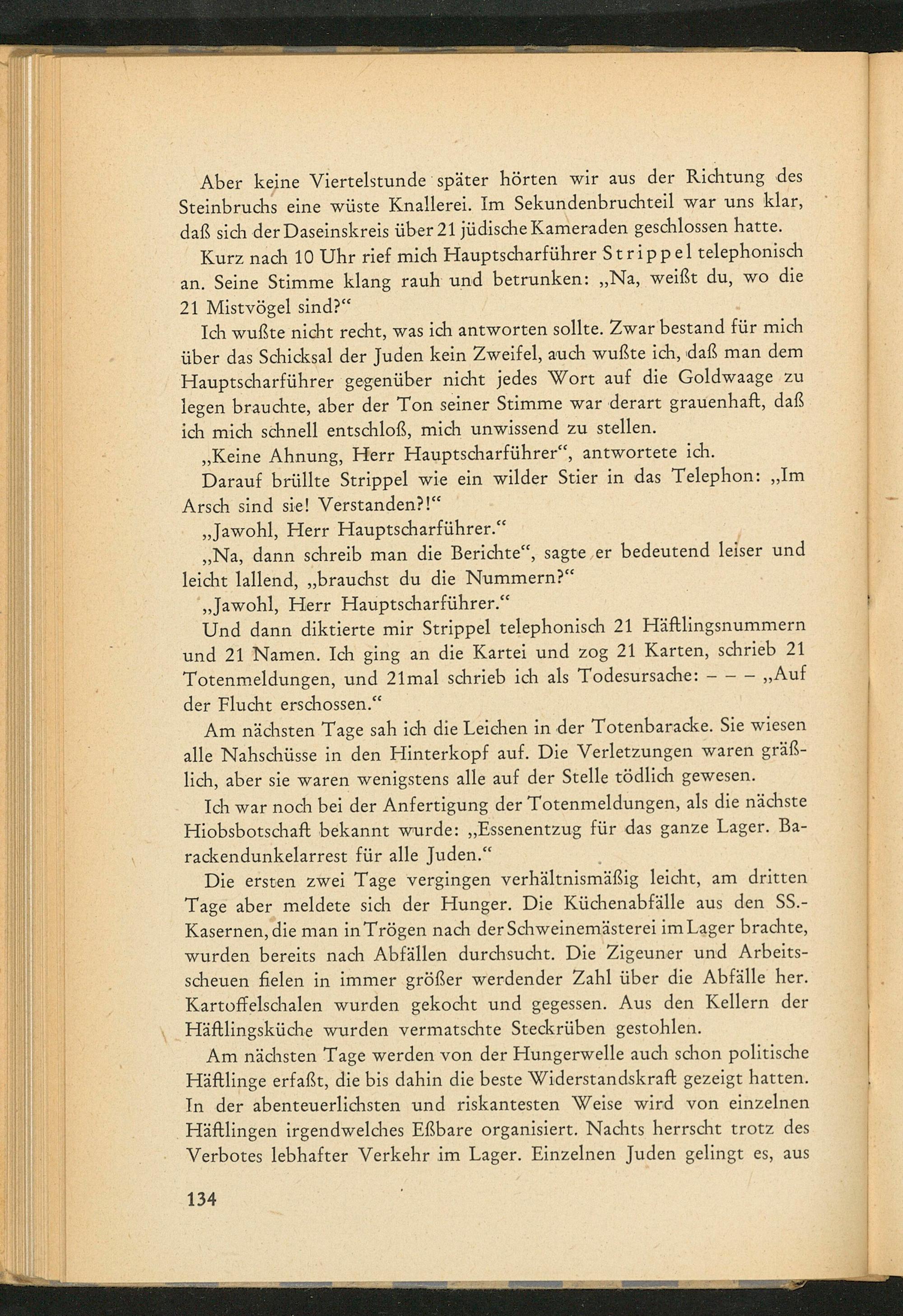 Am nächsten Tage werden von der Hungerwelle auch schon politische Häftlinge erfaßt, die bis dahin die beste Widerstandskraft gezeigt hatten. In der abenteuerlichsten und riskantesten Weise wird von einzelnen Häftlingen irgendwelches Eßbare organisiert. Nachts herrscht trotz des Verbotes lebhafter Verkehr im Lager. Einzelnen Juden gelingt es, aus