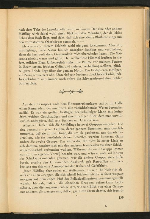 Auf dem Transport nach dem Konzentrationslager traf ich in Halle einen Kameraden, der mir durch sein zurückhaltendes Wesen besonders auffiel. Er war ein großer, kräftiger, breitschultriger Mann mit hoher Stirn, weichen Gesichtszügen und einem ruhigen Blick, dem man unwillkürlich nachspürte, daß sein Besitzer ein Grübler war.
