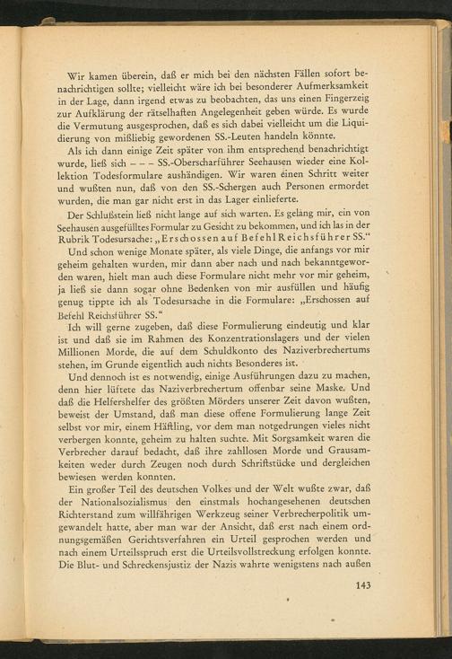 Der Schlußstein ließ nicht lange auf sich warten. Es gelang mir, ein von Seehausen ausgefülltes Formular zu Gesicht zu bekommen, und ich las in der Rubrik Todesursache: ,, Erschossen auf Befehl Reichsführer SS." Und schon wenige Monate später, als viele Dinge, die anfangs vor mir geheim gehalten wurden, mir dann aber nach und nach bekanntgeworden waren, hielt man auch diese Formulare nicht mehr vor mir geheim, ja ließ sie dann sogar ohne Bedenken von mir ausfüllen und häufig genug tippte ich als Todesursache in die Formulare: ,, Erschossen auf Befehl Reichsführer SS."