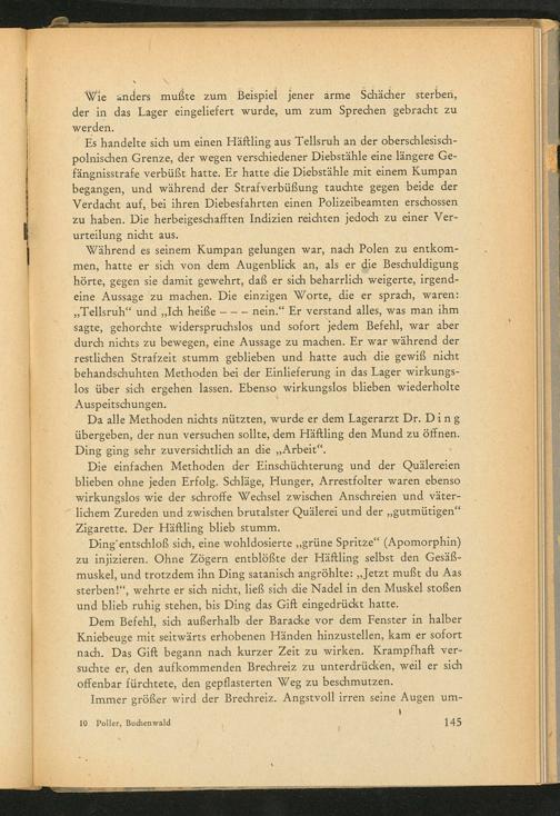 Ding’entschloß sich, eine wohldosierte„grüne Spritze“(Apomorphin) zu injizieren. Ohne Zögern entblößte der Häftling selbst den Gesäß- muskel, und trotzdem ihn Ding satanisch angröhlte:„Jetzt mußt du Aas sterben!“, wehrte er sich nicht, ließ sich die Nadel in den Muskel stoßen und blieb ruhig stehen, bis Ding das Gift eingedrückt hatte.
