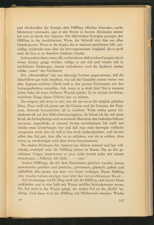 Da schaltet Hofmann den Apparat aus. Schwer atmend und fast vollständig erschöpft steht der Häftling mitten im Raum. Die an ihn gerichteten Fragen beantwortet er jetzt nicht einmal mehr mit seinem monotonen: ,, Tellsruh. Ich heiße--- nein."