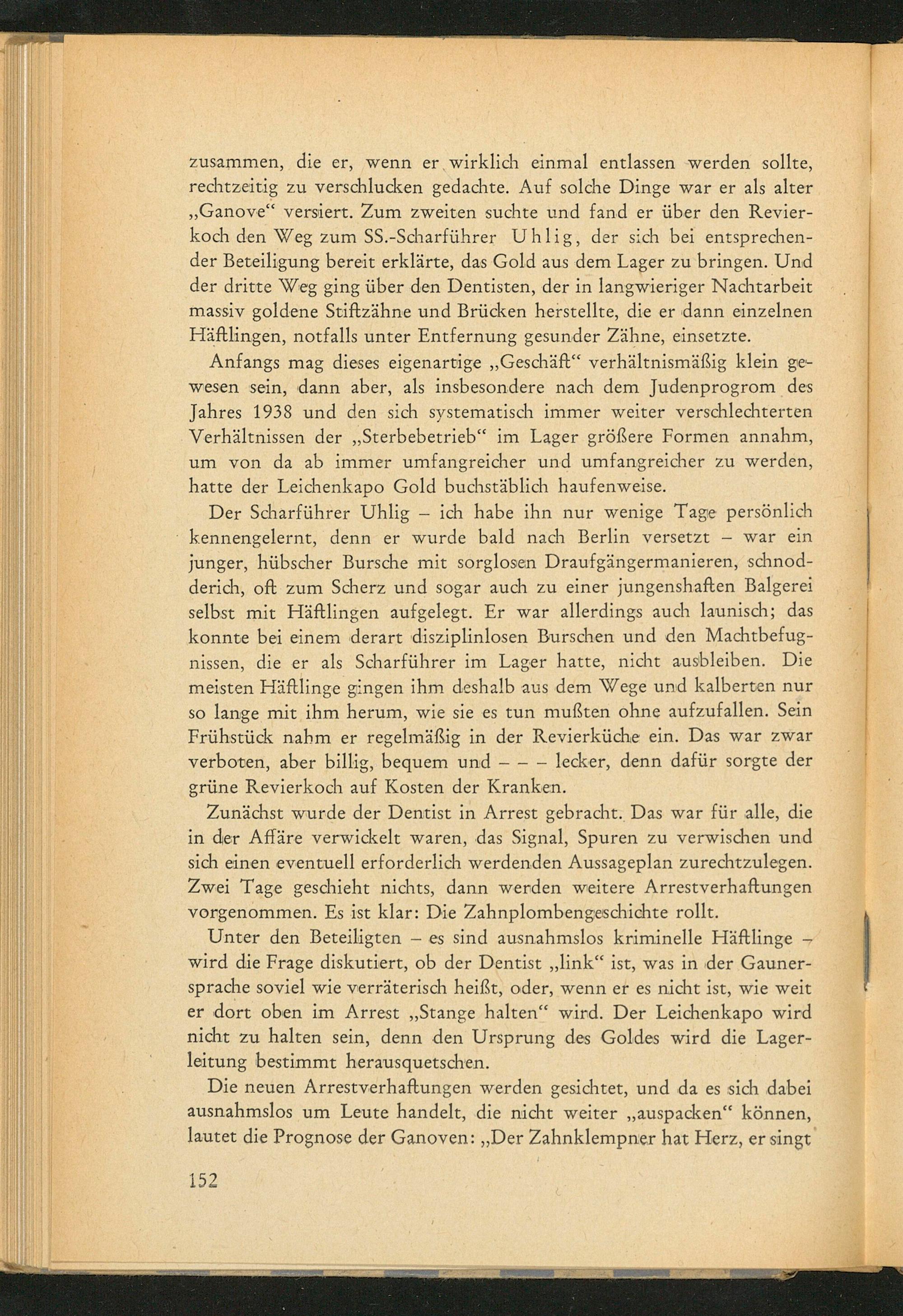 Unter den Beteiligten- es sind ausnahmslos kriminelle Häftlinge wird die Frage diskutiert, ob der Dentist ,, link" ist, was in der Gaunersprache soviel wie verräterisch heißt, oder, wenn er es nicht ist, wie weit er dort oben im Arrest ,, Stange halten" wird. Der Leichenkapo wird nicht zu halten sein, denn den Ursprung des Goldes wird die Lagerleitung bestimmt herausquetschen.