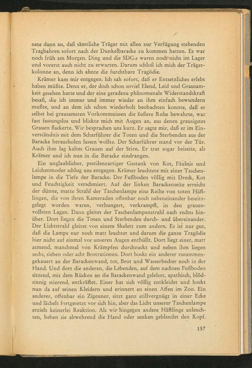 Ein unglaublicher, pestilenzartiger Gestank von Kot, Fäulnis und Leichenmoder schlug uns entgegen. Krämer leuchtete mit einer Taschenlampe in die Tiefe der Baracke. Der Fußboden völlig mit Dreck, Kot und Feuchtigkeit verschmiert. Auf der linken Barackenseite erreicht der dünne, matte Strahl der Taschenlampe eine Reihe von toten Häftlingen, die von ihren Kameraden offenbar noch nebeneinander beseitegelegt worden waren, verhungert, verkrampft, in den grauenvollsten Lagen. Dann gleitet der Taschenlampenstrahl nach rechts hinüber. Dort liegen die Toten und Sterbenden durch- und übereinander. Der Lichtstrahl gleitet von einem Skelett zum andern. Es ist nur gut, daß die Lampe nur noch matt leuchtet und darum die ganze Tragödie hier nicht auf einmal vor unseren Augen enthüllt. Dort liegt einer, matt atmend, manchmal von Krämpfen durchzuckt und neben ihm liegen sechs, sieben oder acht Brotrationen. Dort hockt ein anderer zusammengekauert an der Barackenwand, tot, Brot und Wasserbecher noch in der Hand. Und dort die anderen, die Lebenden, auf dem nackten Fußboden sitzend, mit dem Rücken an die Barackenwand gelehnt, apathisch, blödsinnig stierend, entkräftet. Einer hat sich völlig entkleidet und hockt nun da auf seinen Kleidern und erinnert an einen Affen im Zoo. Ein anderer, offenbar ein Zigeuner, sitzt ganz stillvergnügt in einer Ecke und lächelt fortgesetzt vor sich hin, aber das Licht unserer Taschenlampe erzielt keinerlei Reaktion. Als wir hingegen andere Häftlinge anleuchten, heben sie abwehrend die Hand oder senken geblendet den Kopf.