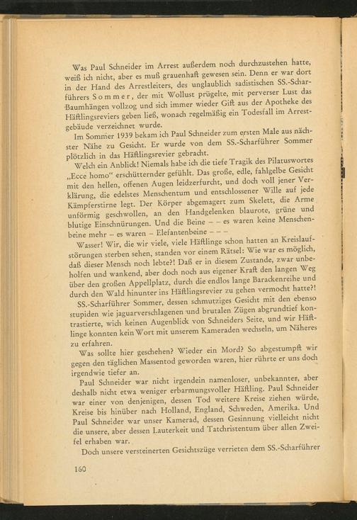 Im Sommer 1939 bekam ich Paul Schneider zum ersten Male aus nächster Nähe zu Gesicht. Er wurde von dem SS. - Scharführer Sommer plötzlich in das Häftlingsrevier gebracht.