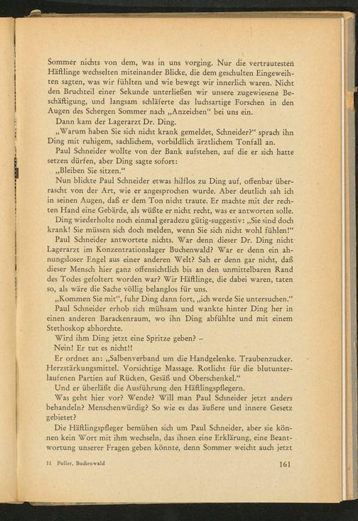 Paul Schneider antwortete nichts. War denn dieser Dr. Ding nicht Lagerarzt im Konzentrationslager Buchenwald ? War er denn ein ahnungsloser Engel aus einer anderen Welt? Sah er denn gar nicht, daß dieser Mensch hier ganz offensichtlich bis an den unmittelbaren Rand des Todes gefoltert worden war? Wir Häftlinge, die dabei waren, taten so, als wäre die Sache völlig belanglos für uns.