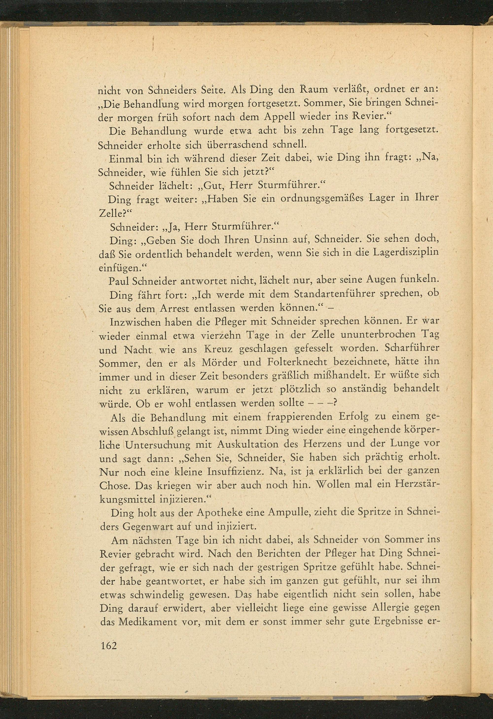 nicht von Schneiders Seite. Als Ding den Raum verläßt, ordnet er an: ,, Die Behandlung wird morgen fortgesetzt. Sommer, Sie bringen Schneider morgen früh sofort nach dem Appell wieder ins Revier."