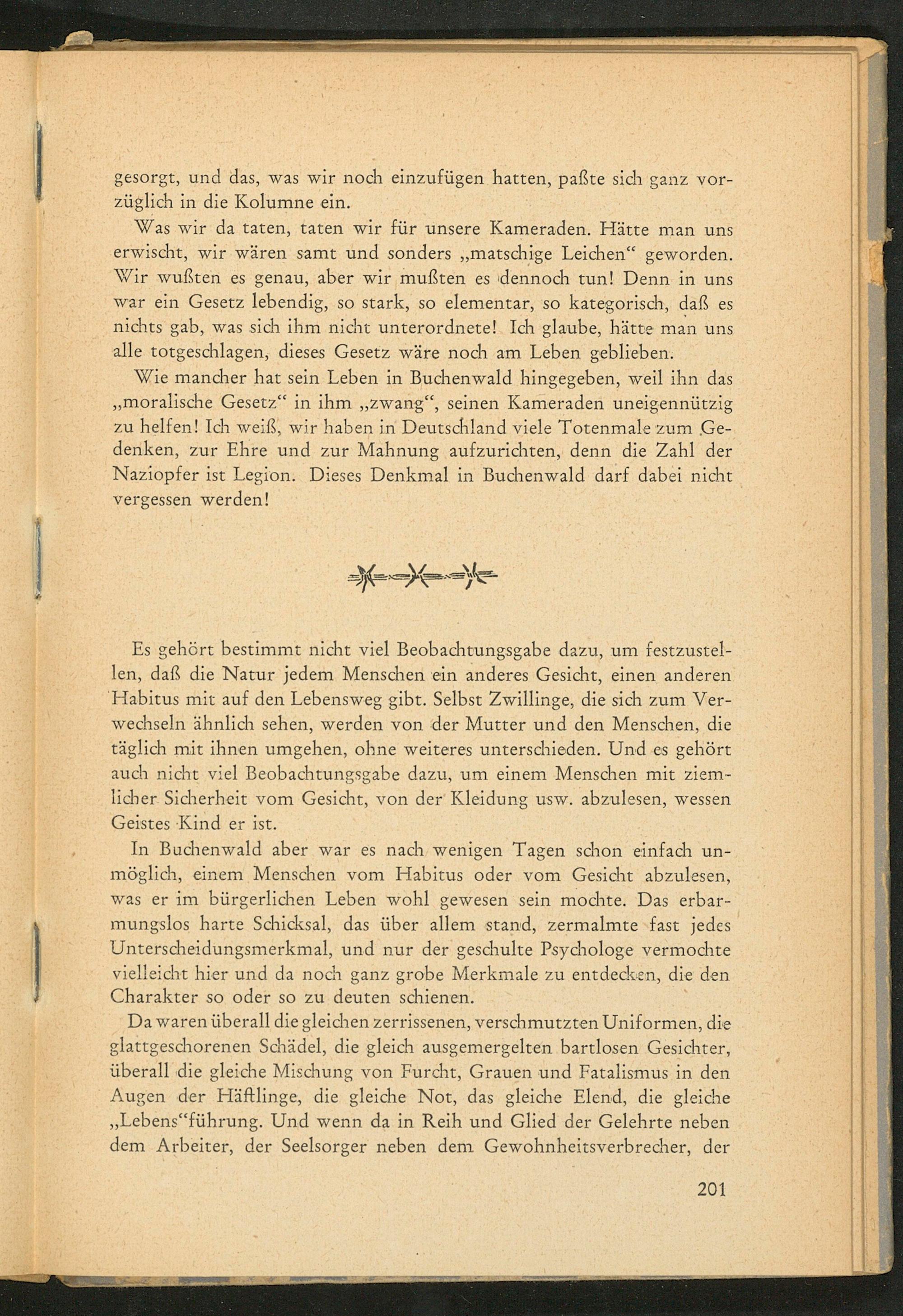 In Buchenwald aber war es nach wenigen Tagen schon einfach unmöglich, einem Menschen vom Habitus oder vom Gesicht abzulesen, was er im bürgerlichen Leben wohl gewesen sein mochte. Das erbarmungslos harte Schicksal, das über allem stand, zermalmte fast jedes Unterscheidungsmerkmal, und nur der geschulte Psychologe vermochte vielleicht hier und da noch ganz grobe Merkmale zu entdecken, die den Charakter so oder so zu deuten schienen.