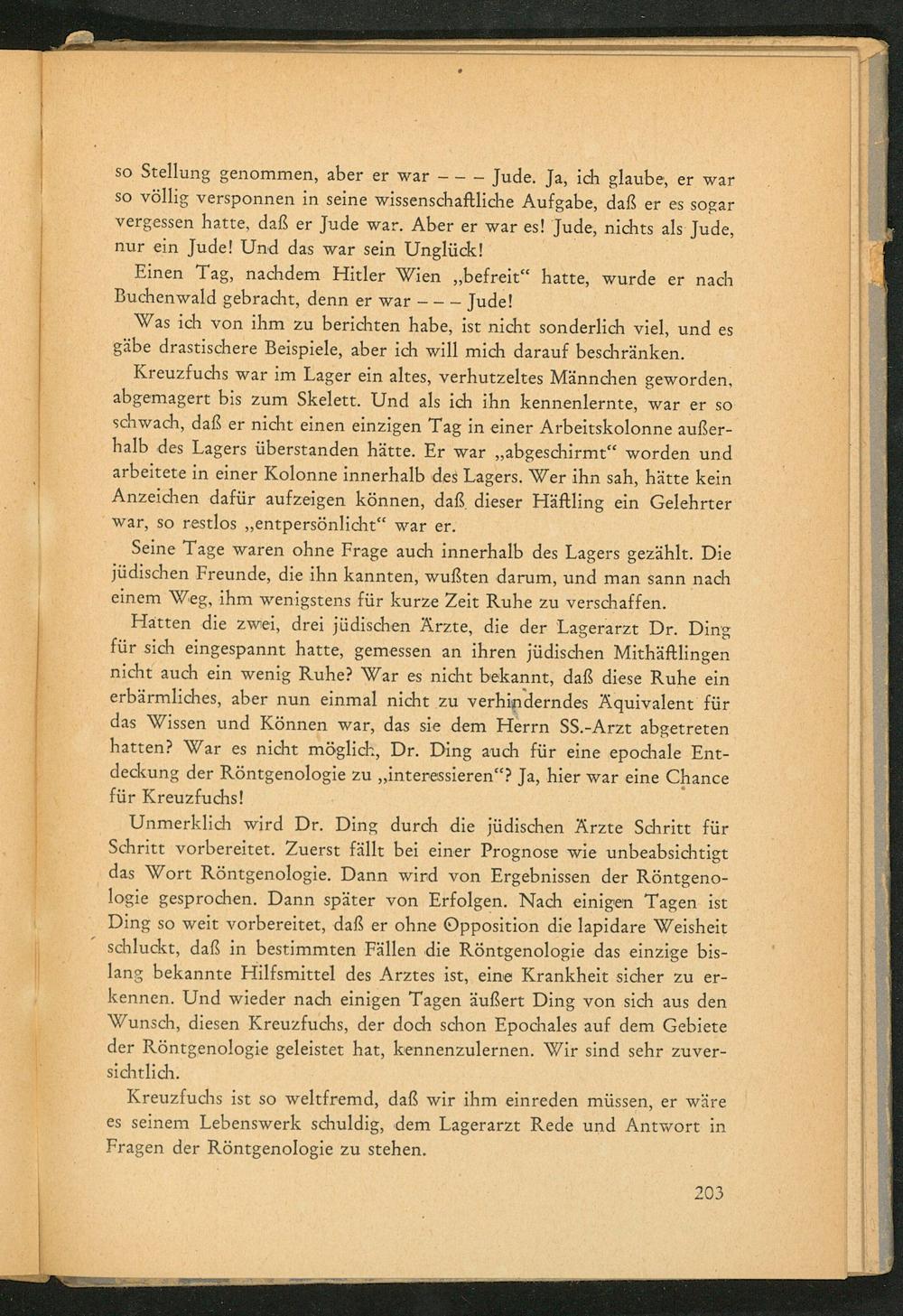 Hatten die zwei, drei jüdischen Ärzte, die der Lagerarzt Dr. Ding für sich eingespannt hatte, gemessen an ihren jüdischen Mithäftlingen nicht auch ein wenig Ruhe? War es nicht bekannt, daß diese Ruhe ein erbärmliches, aber nun einmal nicht zu verhinderndes Aquivalent für das Wissen und Können war, das sie dem Herrn SS .- Arzt abgetreten hatten? War es nicht möglich, Dr. Ding auch für eine epochale Entdeckung der Röntgenologie zu ,, interessieren"? Ja, hier war eine Chance für Kreuzfuchs!