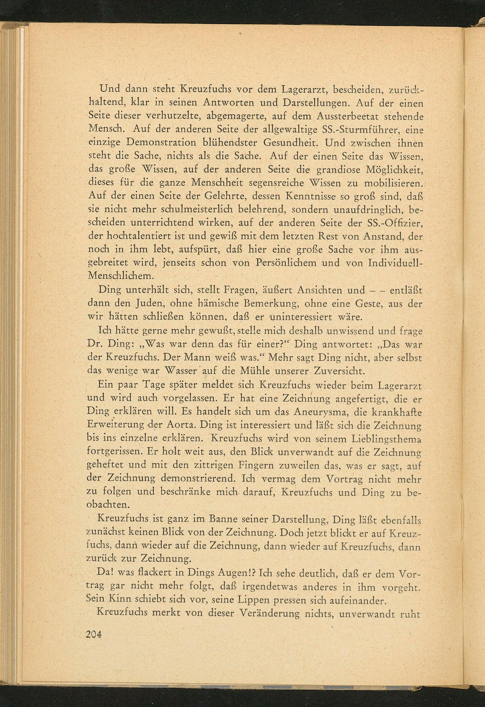 Und dann steht Kreuzfuchs vor dem Lagerarzt, bescheiden, zurückhaltend, klar in seinen Antworten und Darstellungen. Auf der einen Seite dieser verhutzelte, abgemagerte, auf dem Aussterbeetat stehende Mensch. Auf der anderen Seite der allgewaltige SS.- Sturmführer, eine einzige Demonstration blühendster Gesundheit. Und zwischen ihnen steht die Sache, nichts als die Sache. Auf der einen Seite das Wissen, das große Wissen, auf der anderen Seite die grandiose Möglichkeit, dieses für die ganze Menschheit segensreiche Wissen zu mobilisieren.. Auf der einen Seite der Gelehrte, dessen Kenntnisse so groß sind, daß sie nicht mehr schulmeisterlich belehrend, sondern unaufdringlich, bescheiden unterrichtend wirken, auf der anderen Seite der SS. - Offizier, der hochtalentiert ist und gewiß mit dem letzten Rest von Anstand, der noch in ihm lebt, aufspürt, daß hier eine große Sache vor ihm ausgebreitet wird, jenseits schon von Persönlichem und von IndividuellMenschlichem.