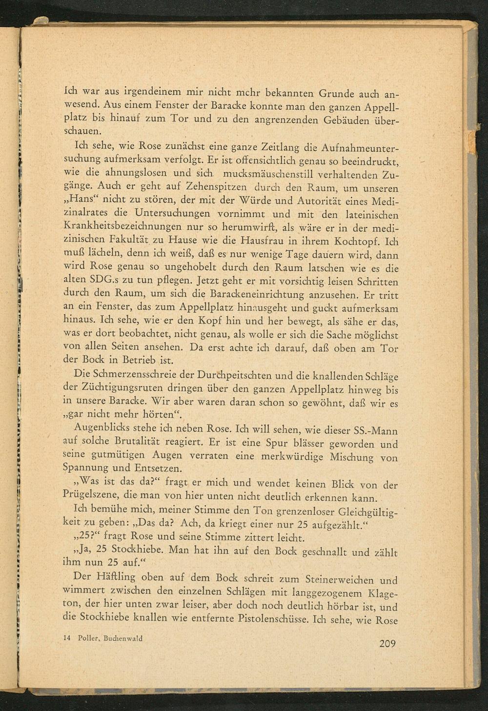 Die Schmerzensschreie der Durchpeitschten und die knallenden Schläge der Züchtigungsruten dringen über den ganzen Appellplatz hinweg bis in unsere Baracke. Wir aber waren daran schon so gewöhnt, daß wir es ,, gar nicht mehr hörten".