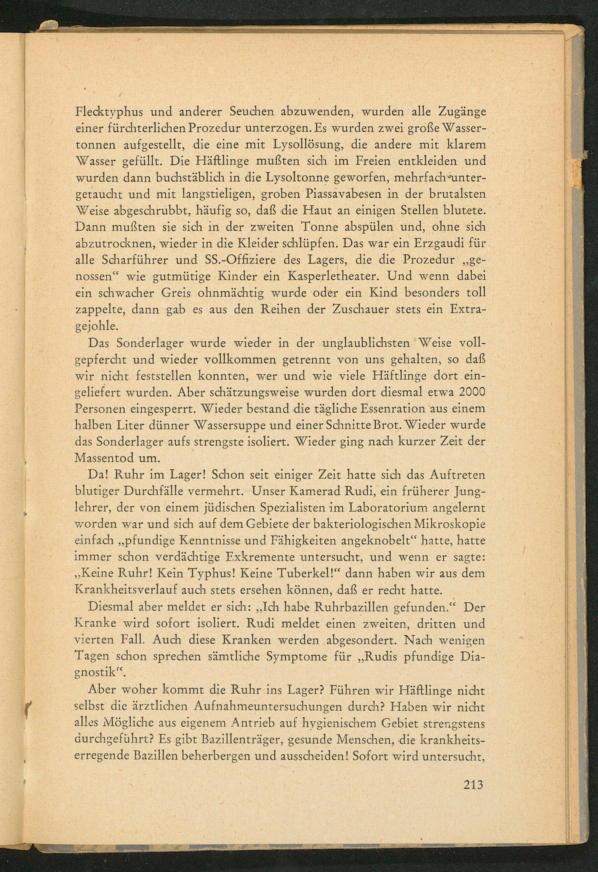 Aber woher kommt die Ruhr ins Lager? Führen wir Häftlinge nicht selbst die ärztlichen Aufnahmeuntersuchungen durch? Haben wir nicht alles Mögliche aus eigenem Antrieb auf hygienischem Gebiet strengstens durchgeführt? Es gibt Bazillenträger, gesunde Menschen, die krankheits- erregende Bazillen beherbergen und ausscheiden! Sofort wird untersucht,