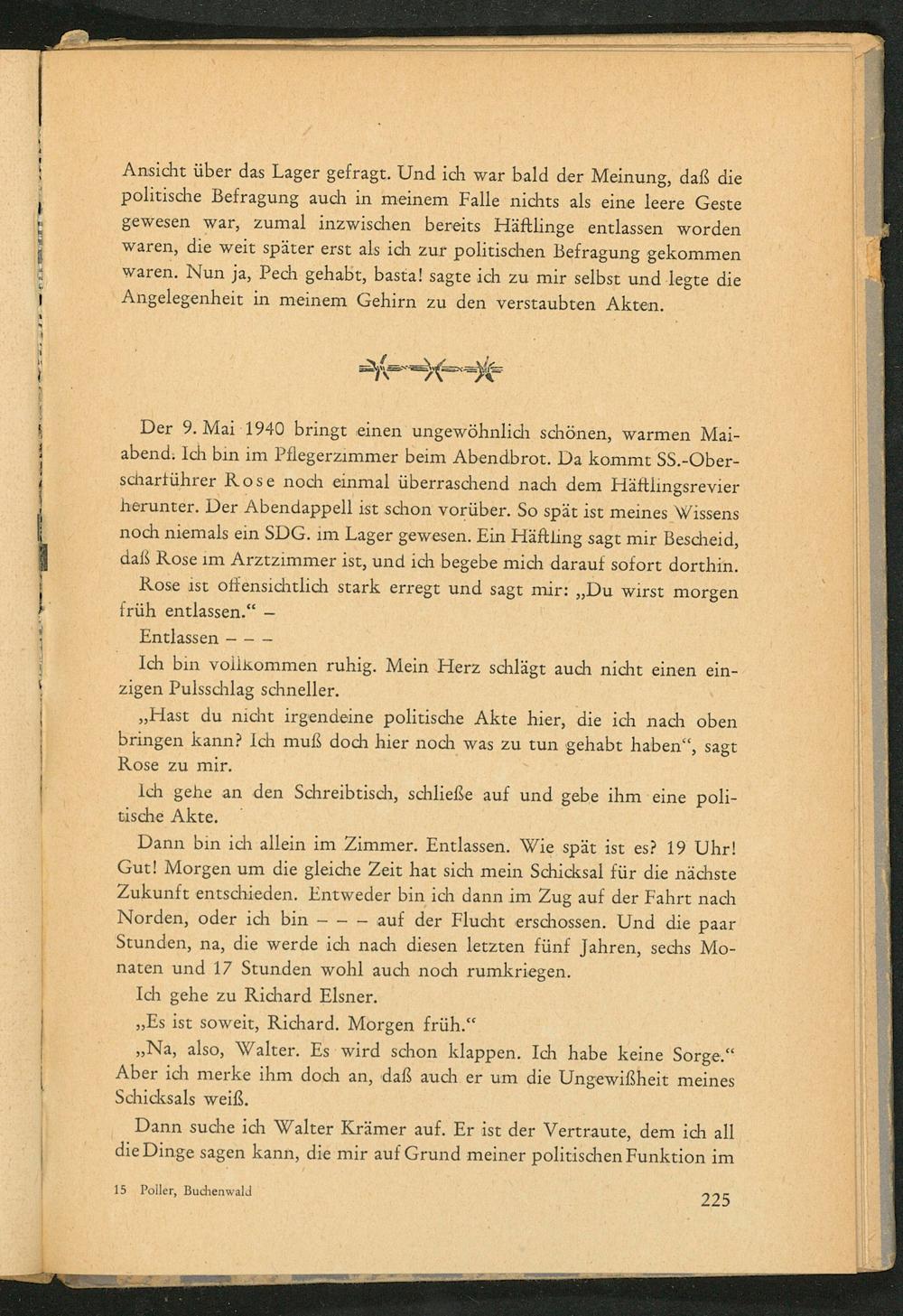 Der 9. Mai 1940 bringt einen ungewöhnlich schönen, warmen Maiabend. Ich bin im Pflegerzimmer beim Abendbrot. Da kommt SS.- Oberscharführer Rose noch einmal überraschend nach dem Häftlingsrevier herunter. Der Abendappell ist schon vorüber. So spät ist meines Wissens noch niemals ein SDG. im Lager gewesen. Ein Häftling sagt mir Bescheid, daß Rose im Arztzimmer ist, und ich begebe mich darauf sofort dorthin. Rose ist offensichtlich stark erregt und sagt mir: ,, Du wirst morgen früh entlassen."