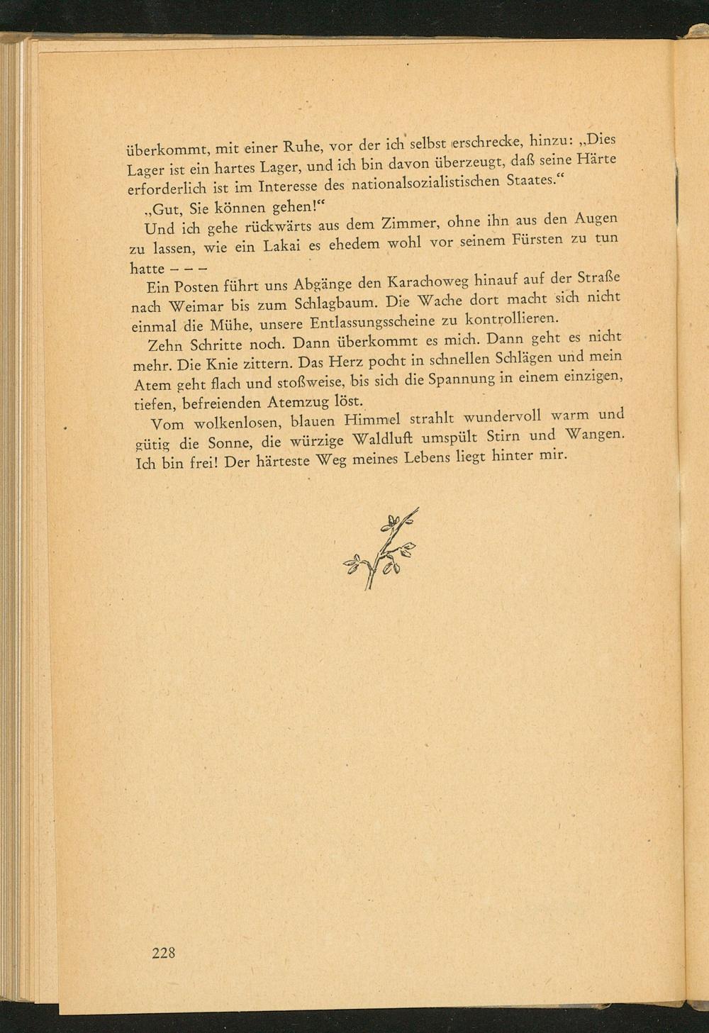 Ein Posten führt uns Abgänge den Karachoweg hinauf auf der Straße nach Weimar bis zum Schlagbaum. Die Wache dort macht sich nicht einmal die Mühe, unsere Entlassungsscheine zu kontrollieren.