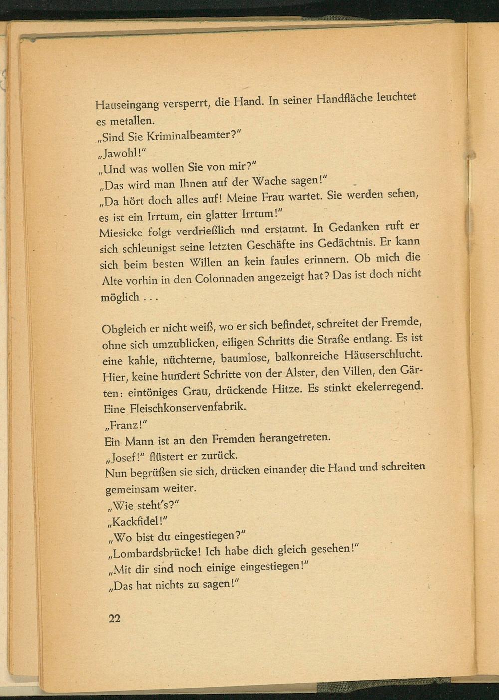 Obgleich er nicht weiß, wo er sich befindet, schreitet der Fremde, ohne sich umzublicken, eiligen Schritts die Straße entlang. Es ist eine kahle, nüchterne, baumlose, balkonreiche Häuserschlucht. Hier, keine hundert Schritte von der Alster, den Villen, den Gärten: eintöniges Grau, drückende Hitze. Es stinkt ekelerregend. Eine Fleischkonservenfabrik.