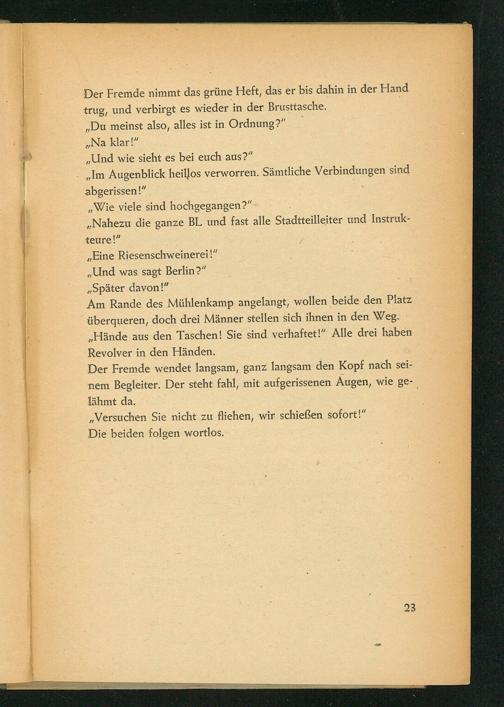 Am Rande des Mühlenkamp angelangt, wollen beide den Platz überqueren, doch drei Männer stellen sich ihnen in den Weg. ,, Hände aus den Taschen! Sie sind verhaftet!" Alle drei haben Revolver in den Händen.
